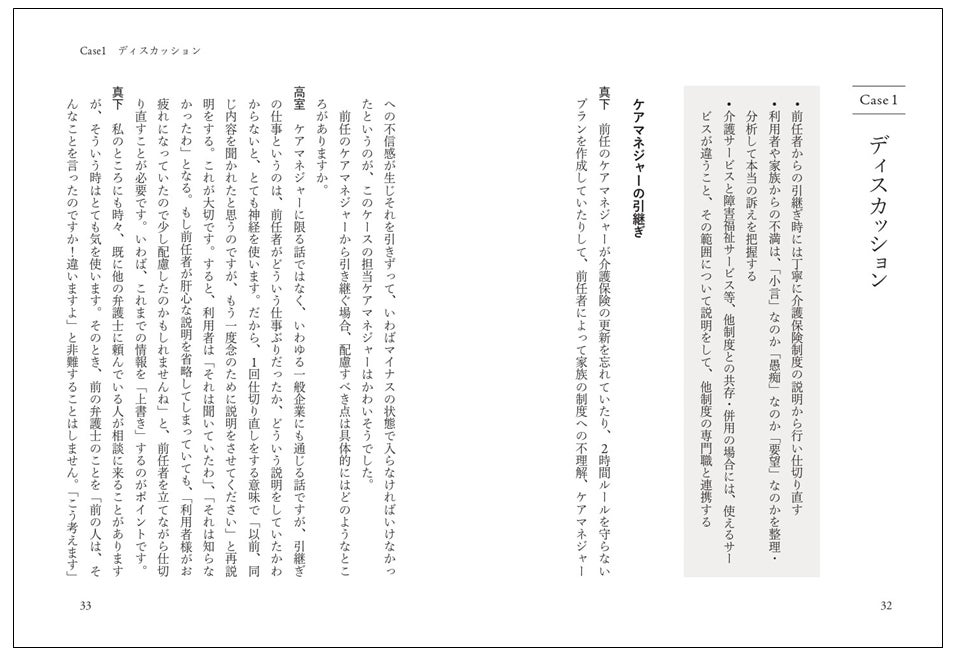 5つの物語ごとに、弁護士の真下美由起氏と介護現場を熟知するケアタウン総合研究所代表の高室成幸氏がディスカッション形式で、現場で行われがちな対応の問題点・課題について、ケアマネジャーの苦悩に寄り添いながら法的な視点での対応策を提案!