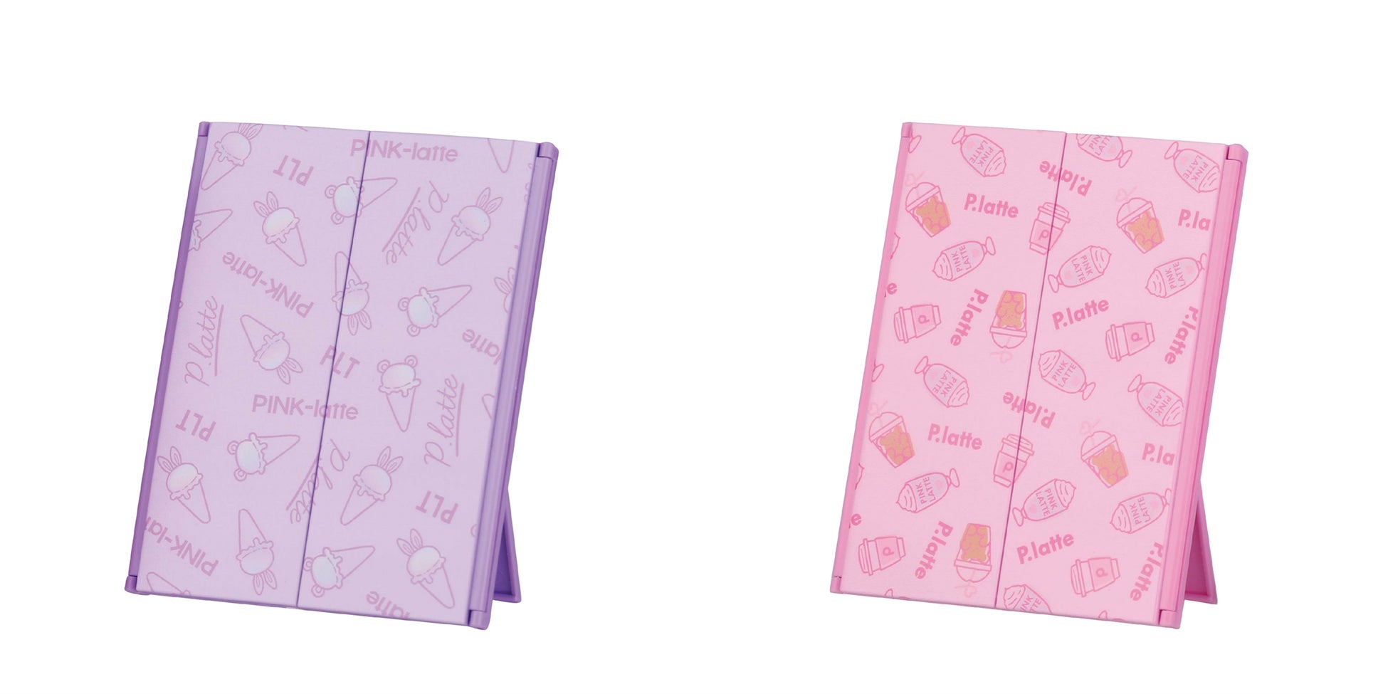「ピンク ラテ」のロゴやアイス、ドリンクがデザインされた三面鏡。パープル、ピンクの2種類。