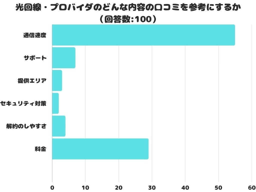 光回線・プロバイダのどんな内容の口コミを参考にするかをアンケートにて調査したところ、1位は「通信速度」でした。