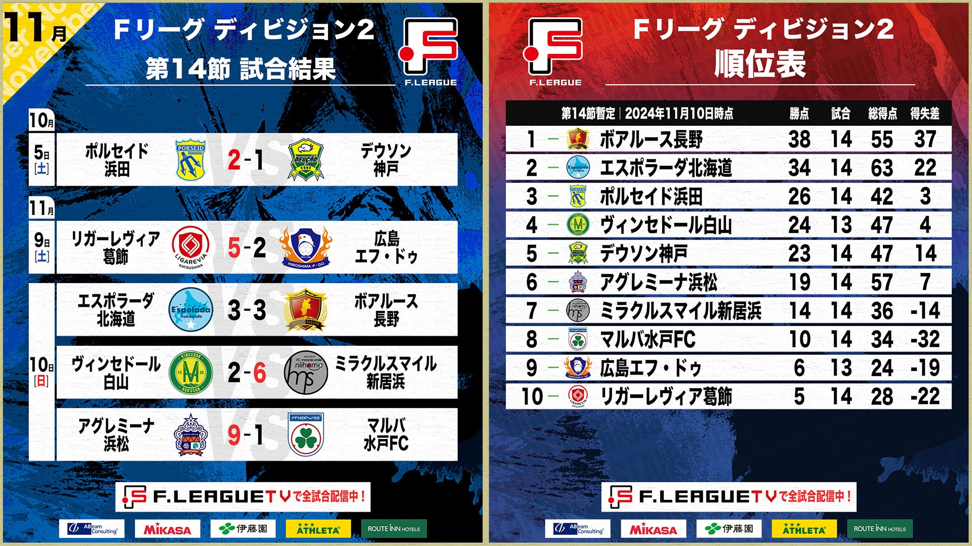 11月9日(土)〜10日(日)に実施したFリーグ2024-2025 ディビジョン2 第14節の4試合について結果をお知らせいたします。