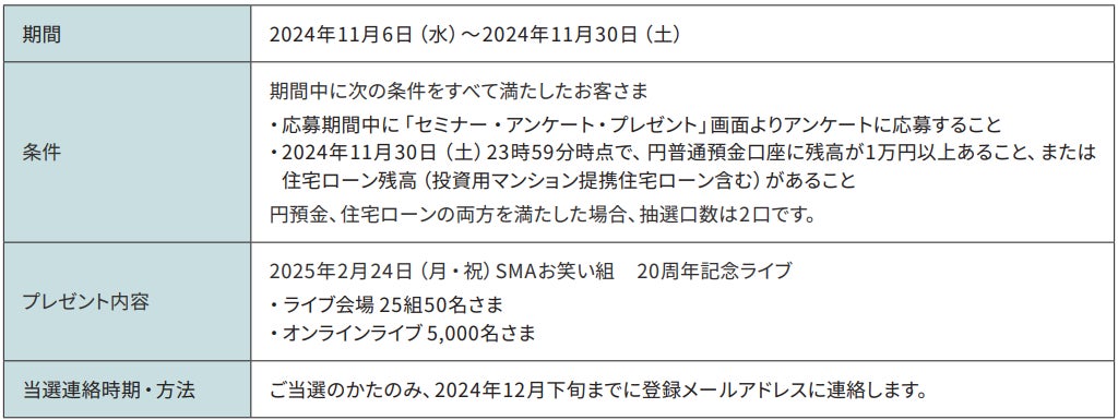 ソニー銀行株式会社(代表取締役社長:南 啓二/本社:東京都千代田区/以下 ソニー銀行)は、2025年2月24日(月・祝)に開催する『SMA50th Anniversary Presents「SMAお笑い組 20周年記念ライブ」 supported by ソニー銀行』に協賛し、2024年11月6日(水)より「Sony Music × Sony Bank Collaboration Days」第四弾 SMAお笑い組 20周年記念ライブ ご招待キャンペーンを実施しますので、お知らせします。