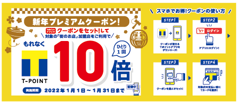 株式会社Tポイント・ジャパン(本社:東京都渋谷区、代表取締役社長:北村和彦)は、2021年1月1日(土)から1月31日(月)まで「新年プレミアムクーポン」を配信いたします。