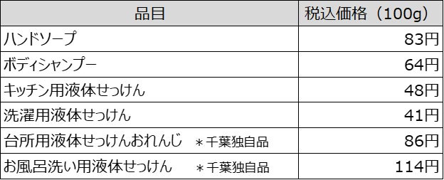 量り売りをするのは、ハンドソープ、ボディシャンプー、キッチン用液体せっけん、洗濯用液体せっけんの4品目で、生活クラブ千葉のデポーではこれに台所用液体せっけん おれんじ、お風呂洗い用せっけんを加えた計6品目です。