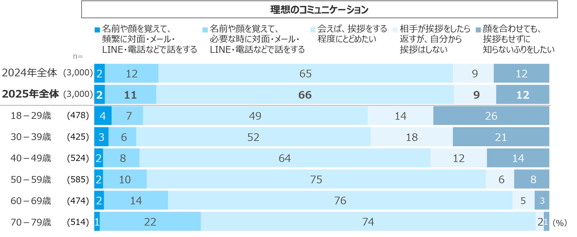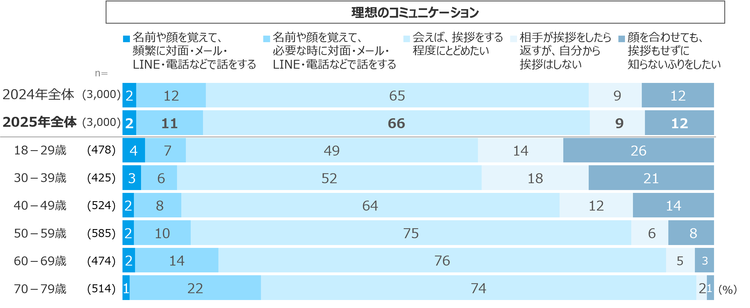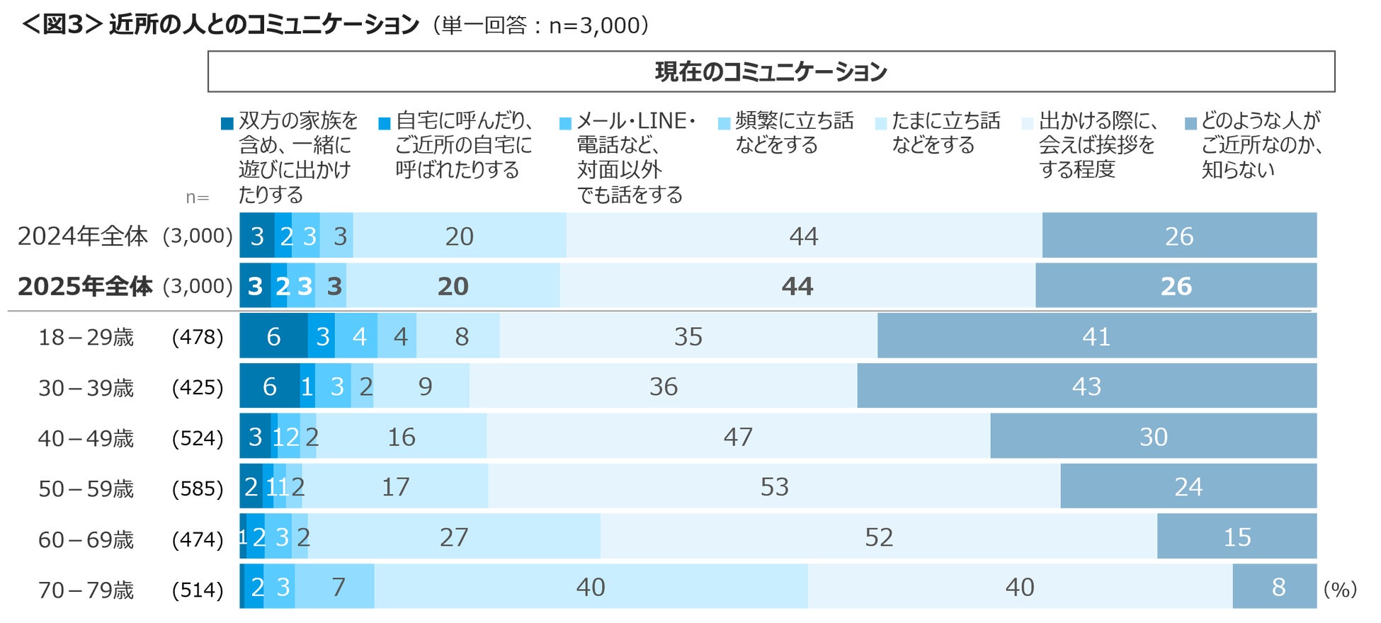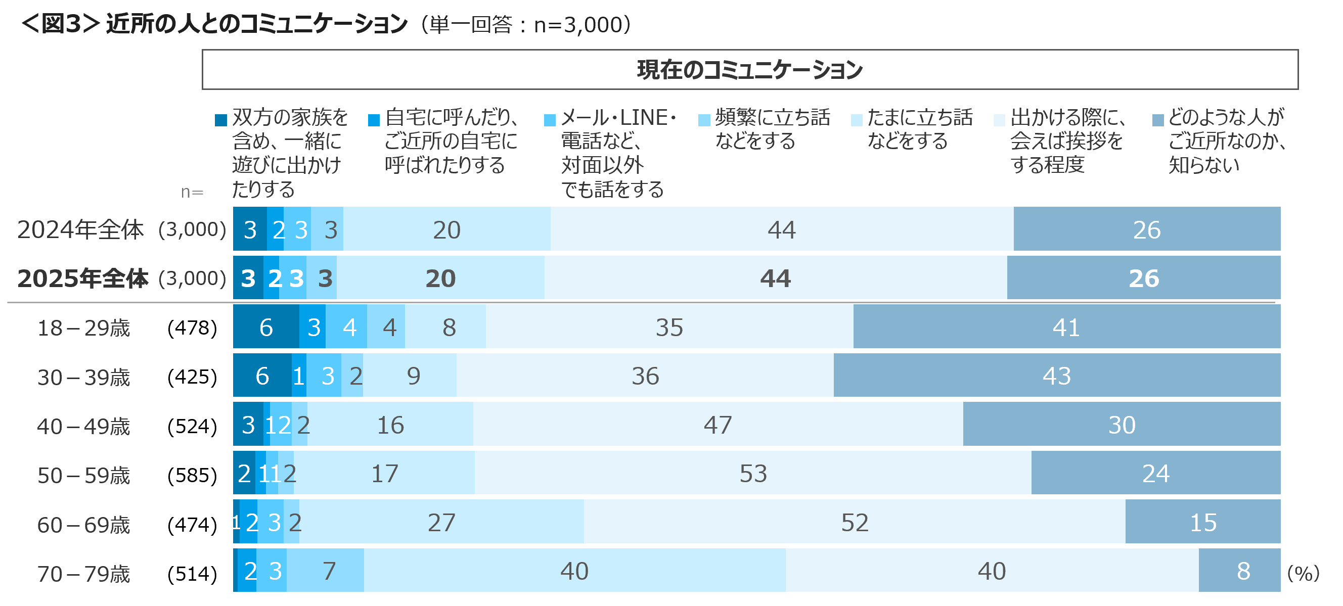 近所の人とは「出かける際に、会えば挨拶をする程度」44%、「どのような人がご近所なのか、知らない」26%であった。18~29歳、30代は「知らない」がボリュームゾーンで4割を占める。70代は「たまに立ち話などをする」「会えば挨拶をする」が4割とコミュニケーションは密である。理想は「会えば、挨拶をする程度にとどめたい」が66%と最多。18~29歳と30代は「顔を合わせても、挨拶もせずに知らないふりをしたい」が2割台と近所とのコミュニケーションには内向的。<図3>