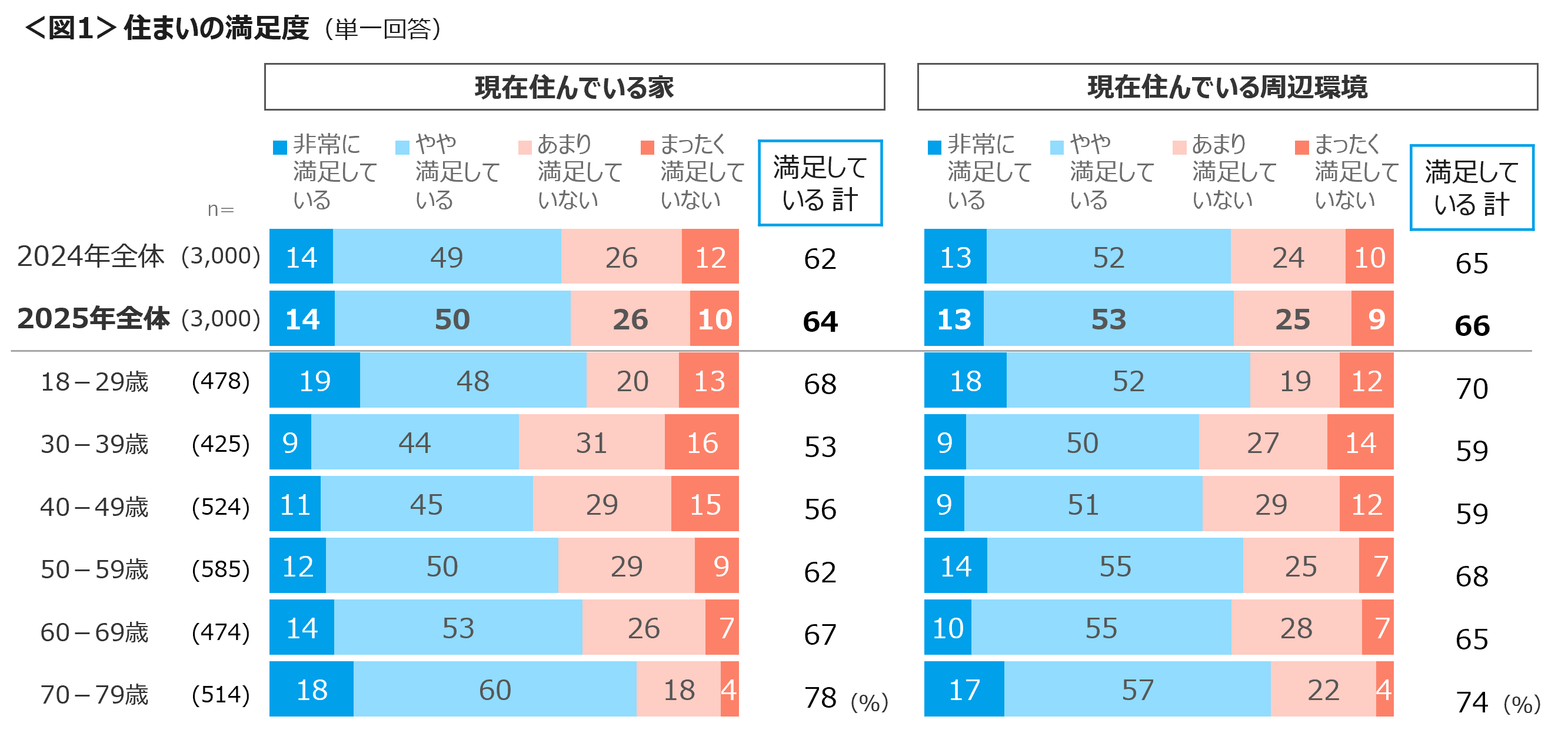 現在住んでいる家に対しては、非常に+やや満足しているは64%、周辺環境は66%。家と周辺環境ともに30~40代は5割台にとどまり、70代は7割を超える。<図1>