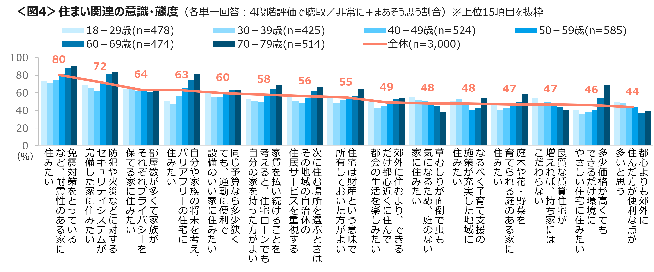 「免震対策をとっているなど、耐震性のある家に住みたい」は80%、「防犯や火災などに対するセキュリティシステムが完備した家に住みたい」72%がTOP2。次いで「部屋数が多くて家族がそれぞれプライバシーを保てる家に住みたい」「自分や家族の将来を考え、バリアフリーの住宅に住みたい」「同じ予算なら多少狭くても、通勤に便利で設備のいい家に住みたい」が6割台。多くの項目は年代が高くなるほど割合は増えるが、「草むしりが面倒で虫も気になるため、庭のない家に住みたい」「良質な賃貸住宅が増えれば、持ち家にはこだわらない」のみ年代が若いほど高い。<図4>