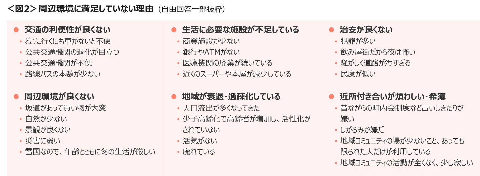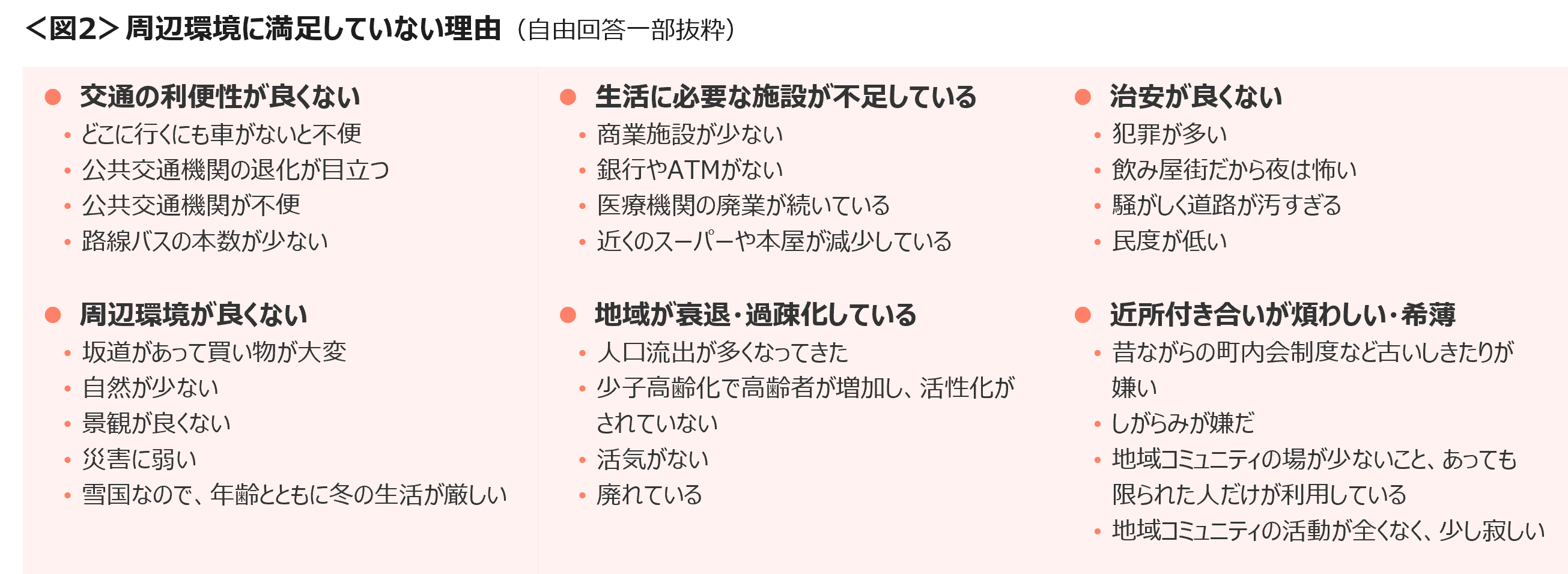 周辺環境への不満は、交通の利便性や治安が良くない、生活に必要な施設が不足している、地域が衰退・過疎化している、近所付き合いが煩わしい・希薄という声があがった。<図2>