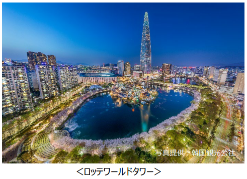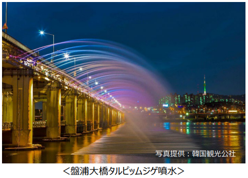 海外旅行先として人気の都市である韓国・ソウルですが、2017年にオープンした「ロッテワールドタワー」は、高さ555メートル、123階建てで韓国でもっとも高く、ソウルのランドマークとなっています。また、タルピッムジゲ(月光虹)噴水は、橋の両側から漢江(ハンガン)の水面に落ちる噴水ショーで、音楽に合わせた水流と色とりどりの照明が美しい虹色の夜景を演出します。近年では人気の映画やドラマのロケ地となっているスポットや、韓国美容やコスメ、韓国ファッションを目的とする旅も人気となっています。