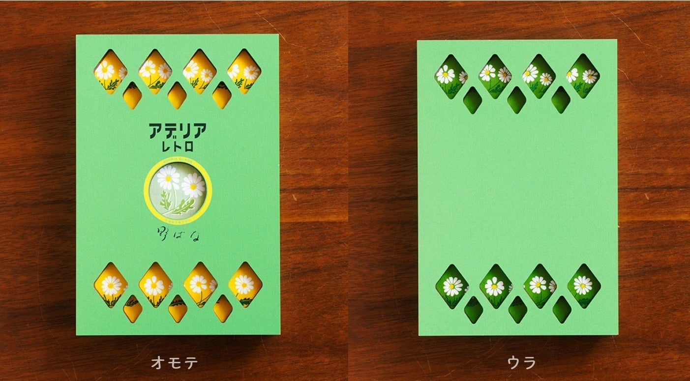 MDF素材の表紙はまるで小さな絵本のようで、くりぬかれた窓からアデリアレトロのモチーフがひょっこり顔をのぞかせます。