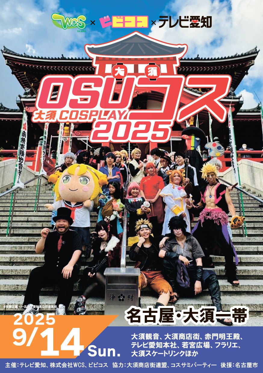 テレビ愛知株式会社、世界コスプレサミットを運営する株式会社WCS、愛知を中心にコスプレイベントを展開するビビコスは、3団体がコラボしたスペシャルコスプレイベント「OSUコス~大須COSPLAY~2025」を2025年9月14日(日)に開催いたします。