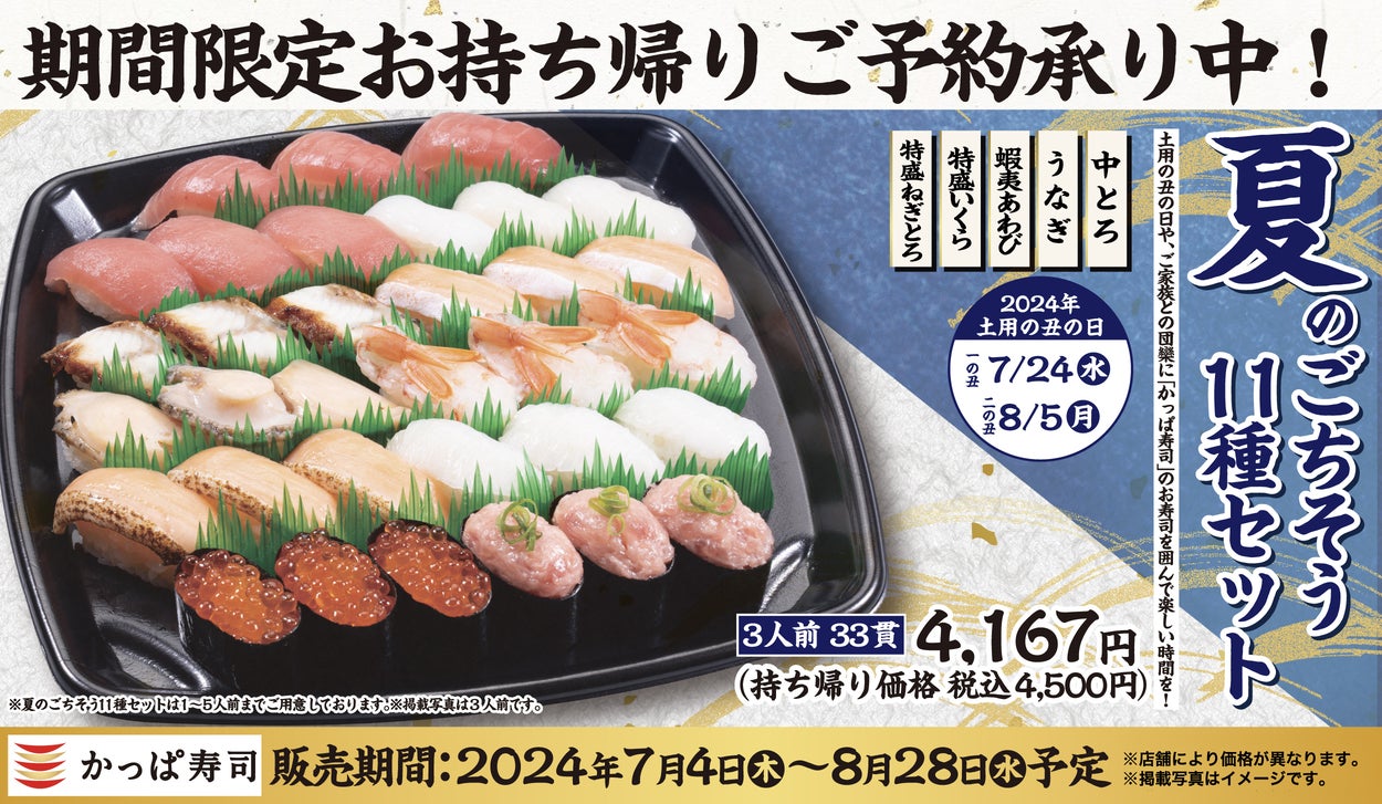 今年の夏は、“土用の丑の日”が7月24日(水)と8月5日(月)の2日あり、旧盆は最大9連休となります。お祭りや花火大会、スポーツ観戦、ご家族の帰省などにぴったりの、かっぱ寿司の期間限定お持ち帰りセット『夏のごちそう11種セット』を囲んで、夏のひと時をお過ごしください。
