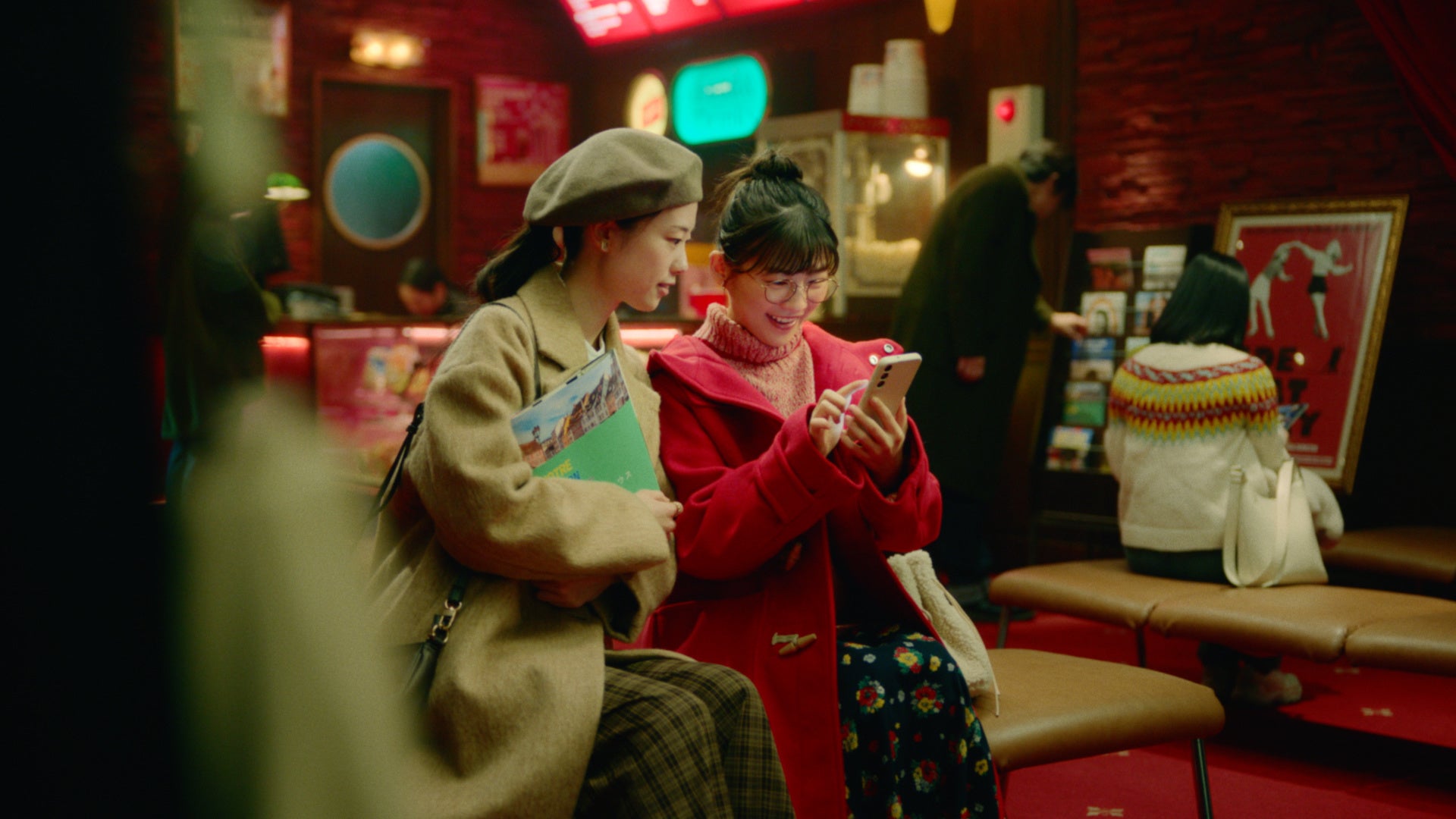 仕事の休憩中、公園で『ポケポケ』をしている伊藤さん。「ポケポケ、、、」とドキドキしながら開封をしていくと「パチリスex」のカードが当たり、ブランコを漕ぎながら大喜び。近くで見ていた子どもも伊藤さんを羨ましそうにじっと見つめます。シーンが変わり、映画館の待合スペースで『ポケポケ』を開く伊藤さん。