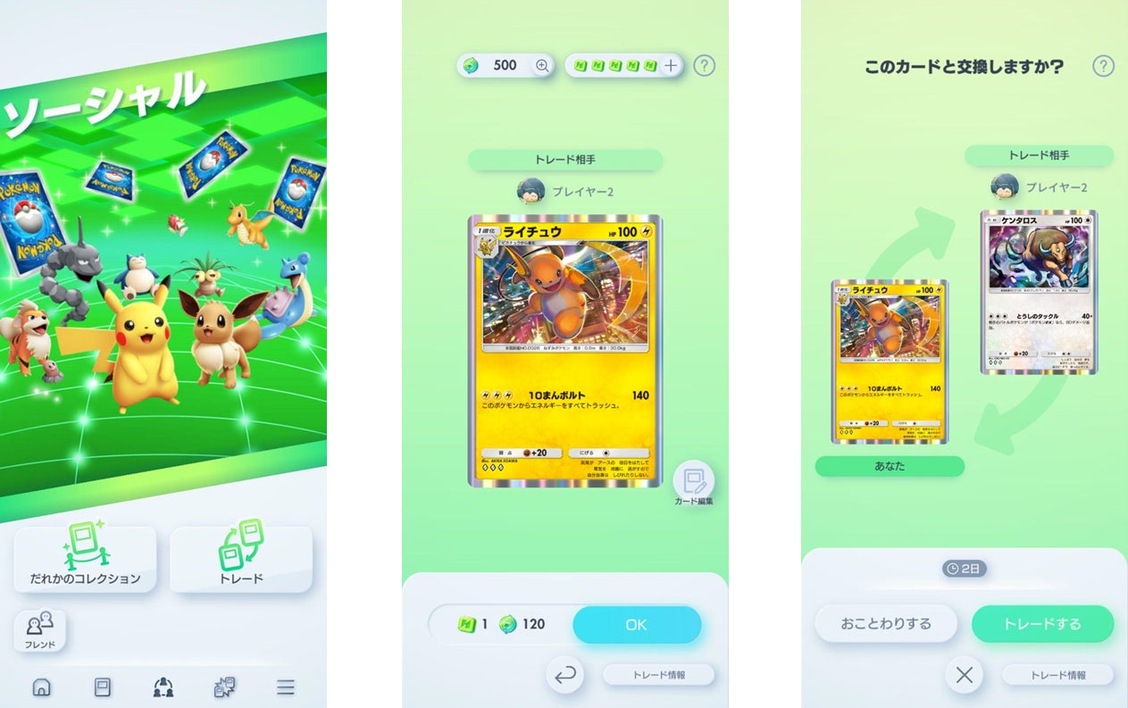 「トレード」は、アイテム等を消費することで、フレンドと一部のポケモンカードを交換することができる機能です。プレイヤー同士で「トレード」を活用して、是非一緒にポケポケのコレクション体験をお楽しみください。