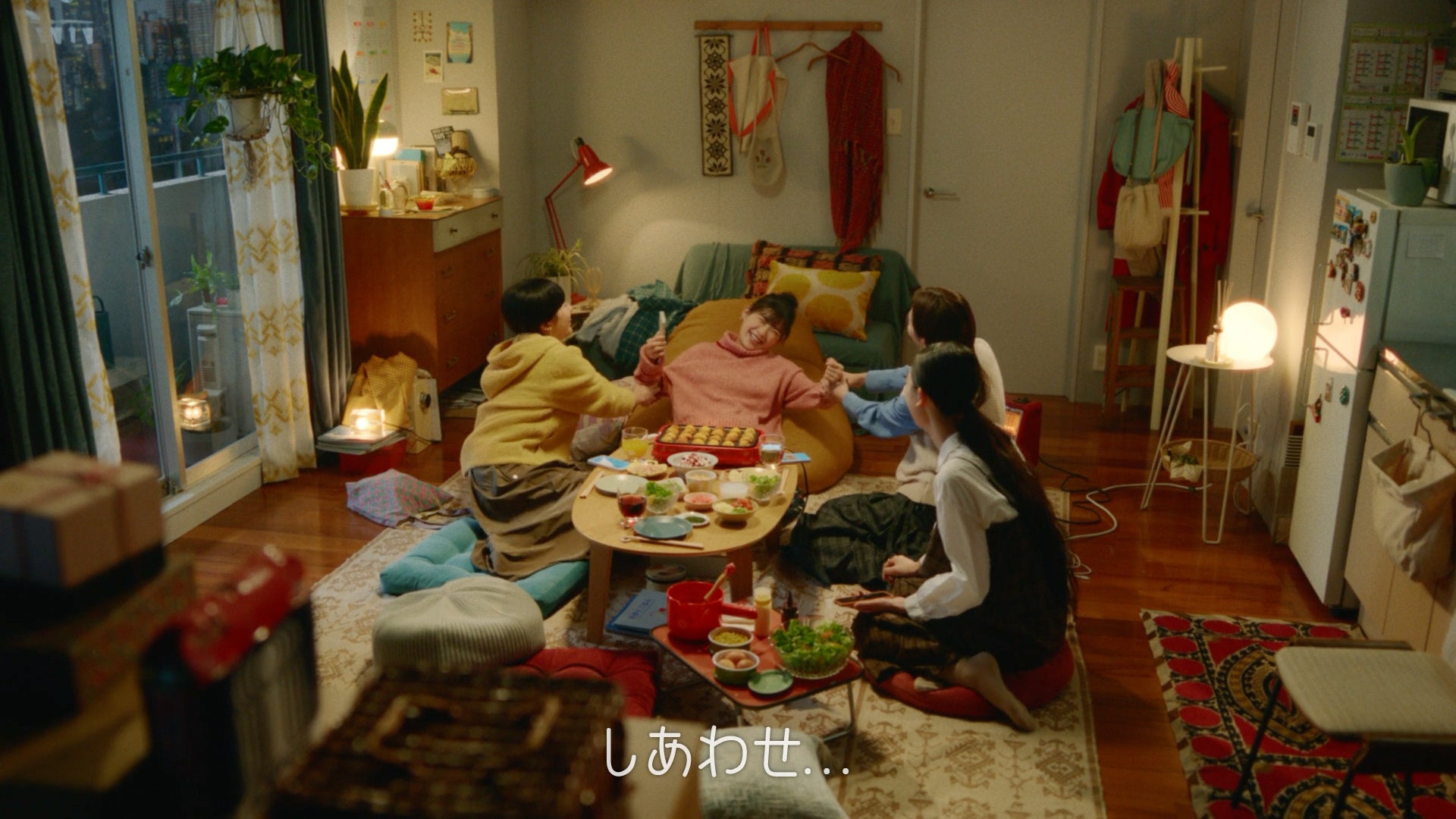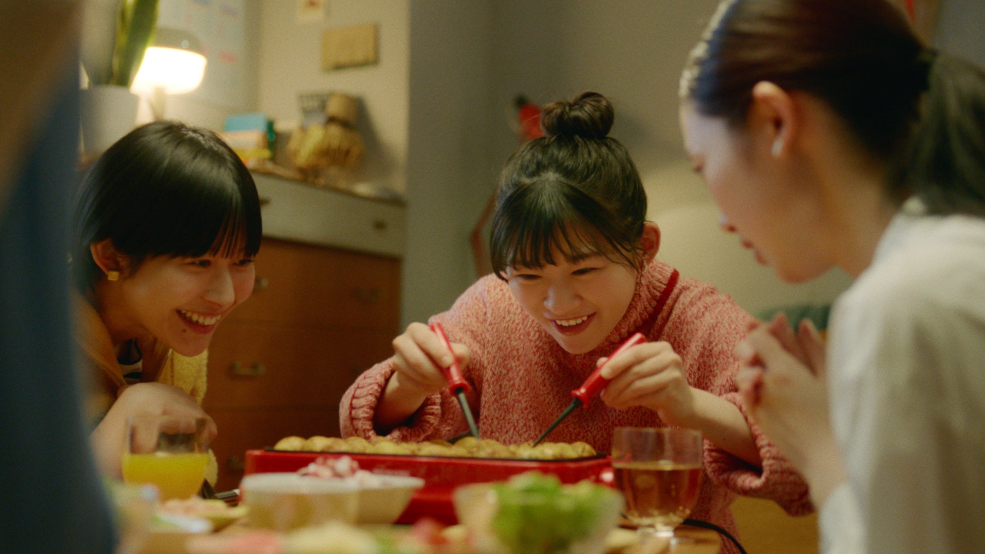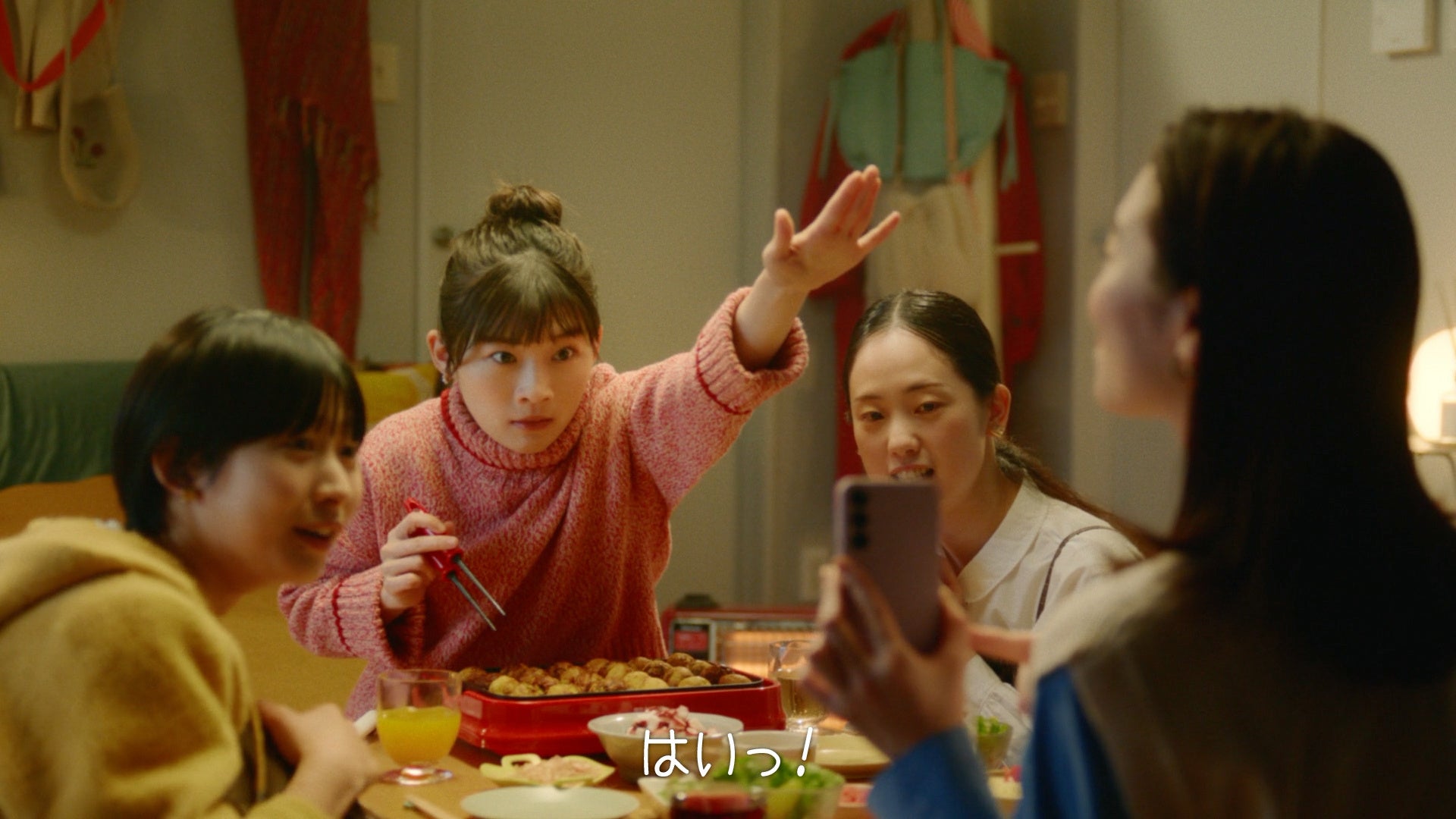 部屋で友だちとホームパーティーをするシーンでは、伊藤さんが共演者3人と実際にたこ焼き器を囲んでたこ焼きをくるくる。慣れた手つきで高速でひっくり返す仕草に、共演者、スタッフから思わず「上手!!」と声が上がっていました。「なんでこんなに(たこ焼きをひっくり返すのが)上手なの?」など、撮影中、休憩中ともに和気あいあいと仲良く会話を交わしていた4人。CM本編での自然な様子にも注目です。