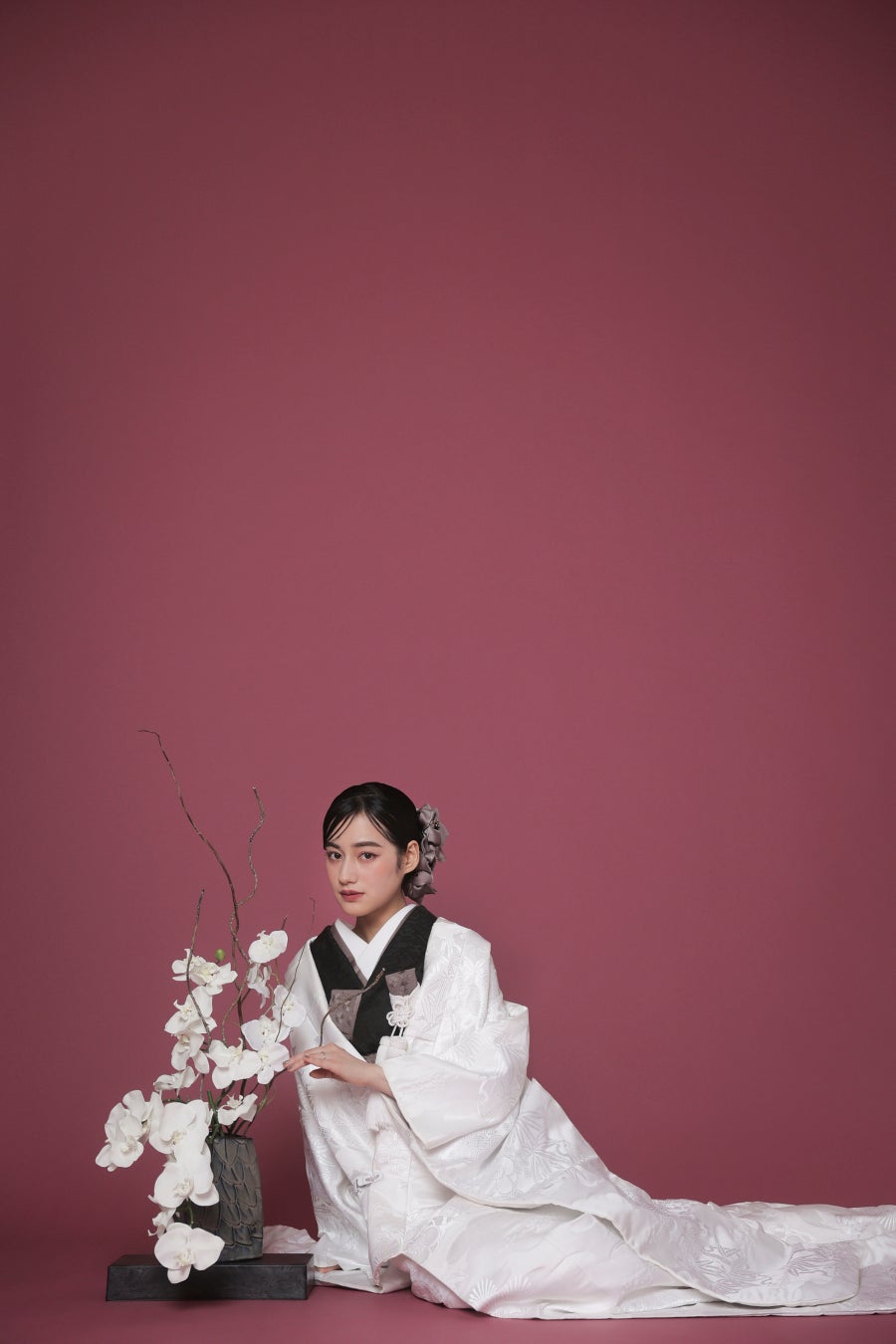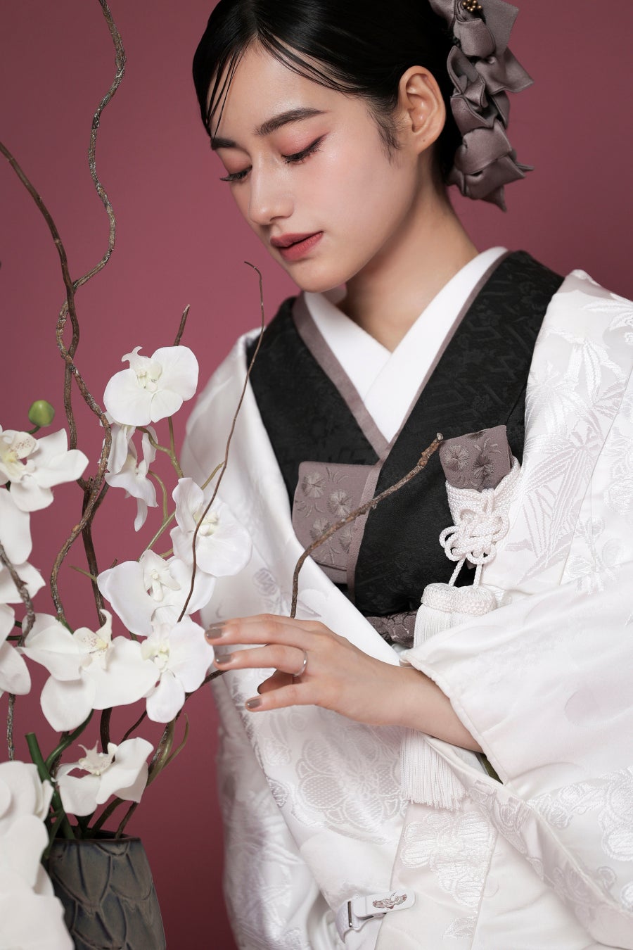 伝統的で高貴な白無垢に、掛下には反対の黒を使いモノトーンでワンランク上の仕上がりに。