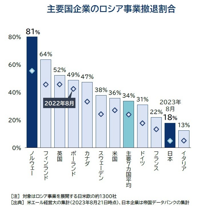 日本のロシア事業撤退、先進主要7カ国で2番目の低さ 1年前からは各国とも増加