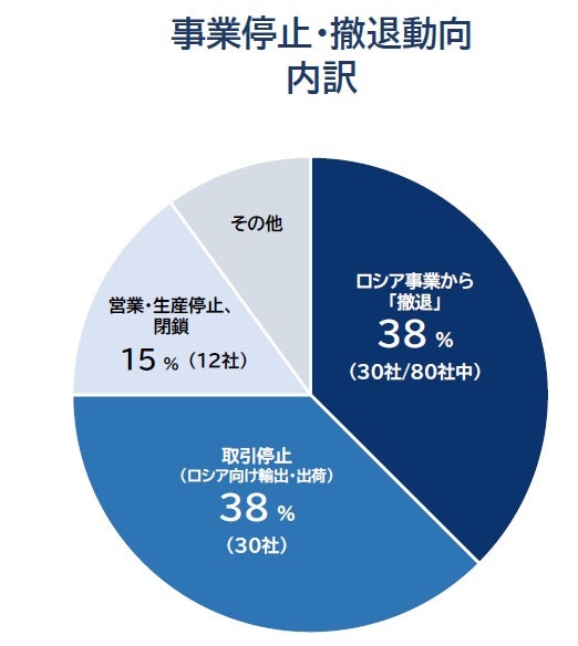 今後は、サプライチェーンの混乱などで現地事業再開のメドが立たないといった物理的な問題を理由として、「様子見=事業停止」だった企業が「撤退」へと方針転換を決断するかが注目されるものの、当面は現状のまま膠着状態が続くとみられる。