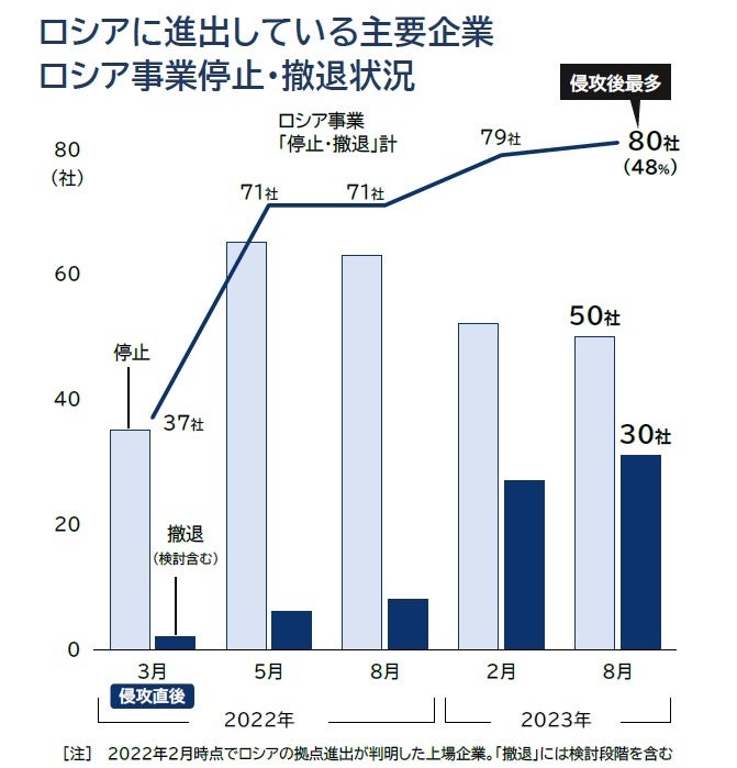 ウクライナ侵攻直前(2022年2月時点)にロシアへの進出が判明していた国内上場企業168社のうち、8月21日までにロシア事業の停止や制限・撤退を発表・公開した企業は80社判明した。進出企業の約半数に上り、22年3月以降で最多を更新した。このうち、ロシア事業から事実上の撤退、または撤退計画を明らかにした企業は30社に上り、全体の約2割に達した。撤退企業は22年8月時点まで10社に満たなかったものの、今年8月までの1年間で20社超の撤退が明らかになった。こうしたケースのほとんどが、ロシア事業について当初「一時停止」措置にとどめていたものの、ロシアでのサービス終了や事業・現地子会社の売却といった脱ロシア対応へと移行したケースが目立った。いずれも、ロシアによるウクライナ侵攻の長期化にともなう原材料や部品・商品の調達難、現地市場の需要縮小、事業再開のメドが立たないことなどを理由に挙げたケースが多く、事業撤退は大手完成車メーカーやサービス産業などにも広がりを見せている。