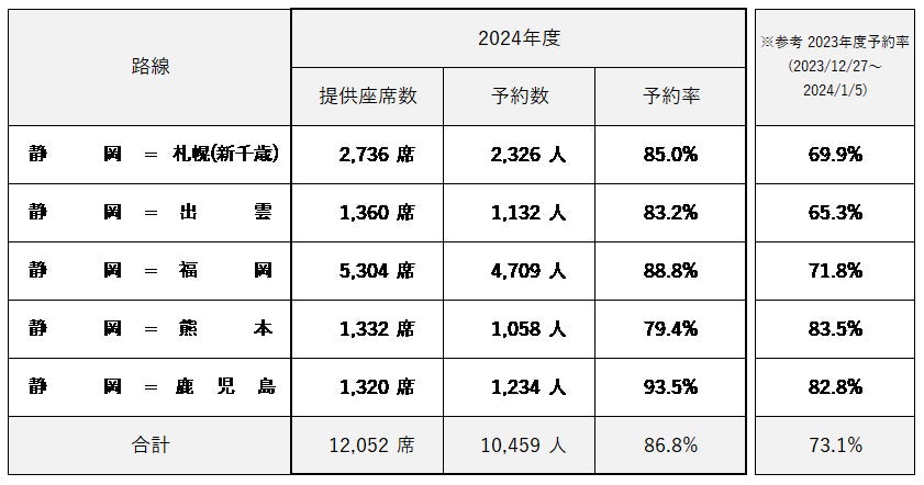 2024年度年末年始期間[2024年12月27日(金)~2024年1月5日(日)]の12月23日(月)時点でのご予約状況について、ご報告いたします。