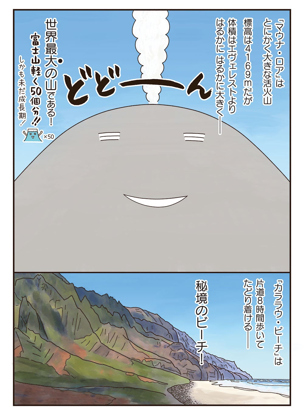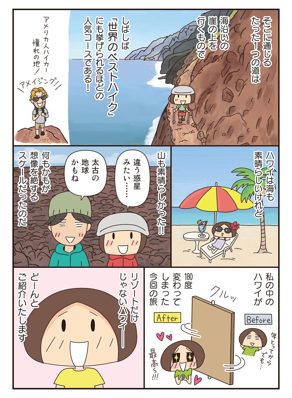 世界最大の山に登り、奇跡のように美しい秘境のビーチへテント泊……。グルメに町歩き、自然も歴史も満喫したハワイで、一生忘れたくない景色と人に出会った。「アロハ」と笑顔で挨拶すると、あたたかい気持ちになるのはなぜだろう? いるだけでハッピーになれる、ハワイの魅力が満載! 上下巻、全12章オールカラーのコミックエッセイ。