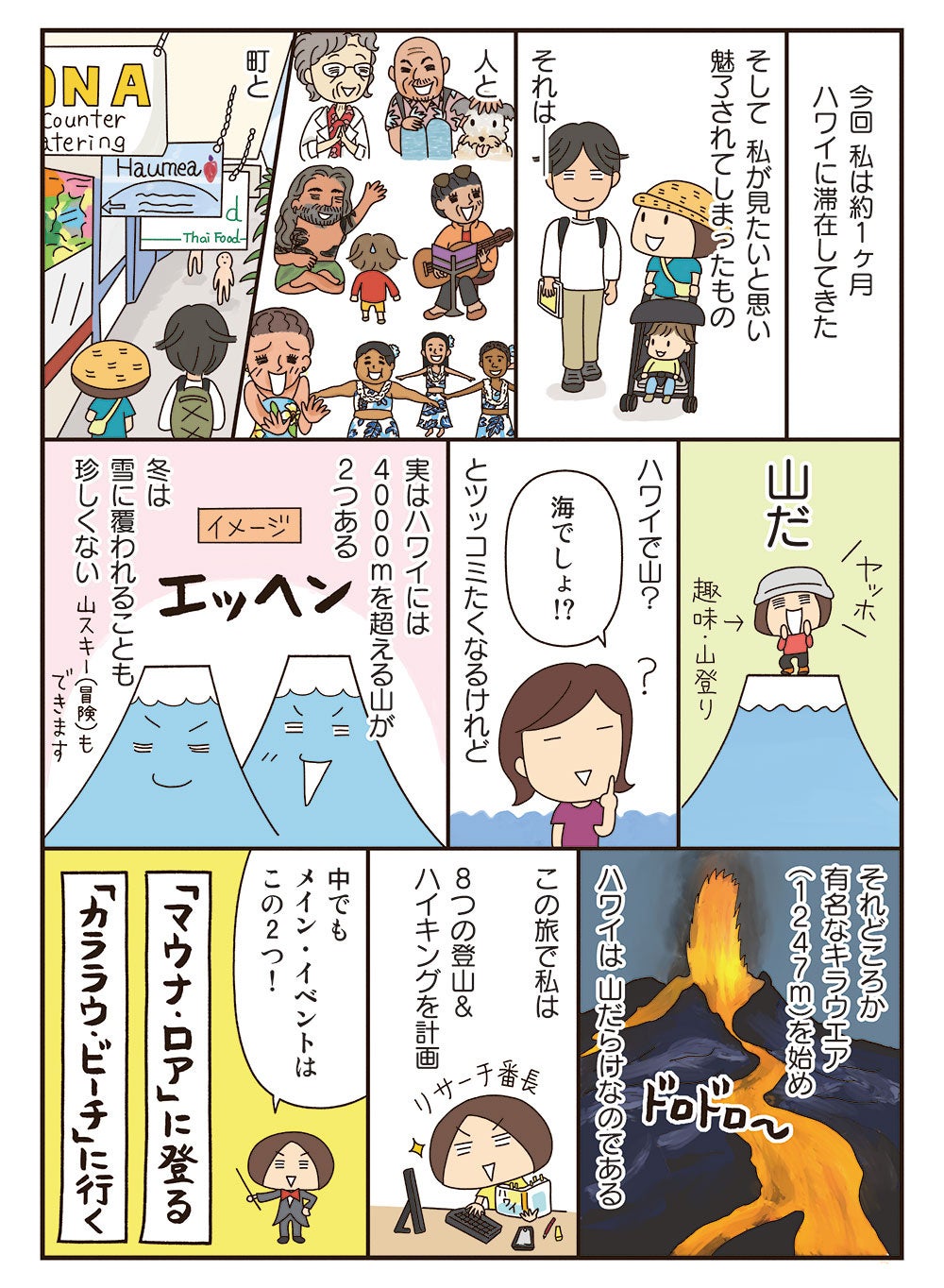 山登りの魅力を分かりやすく面白く伝え、若い世代の山登りブームの火付け役ともなった『山登りはじめました』。その著者で漫画家の鈴木ともこさんの待ちに待った最新刊、テーマは「ハワイ」です! 上巻は「ハワイ島」、下巻は「カウアイ島とオアフ島」で、全12章のオールカラー。読み応えたっぷりの作品になっています。