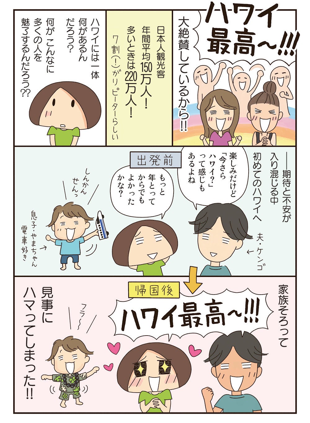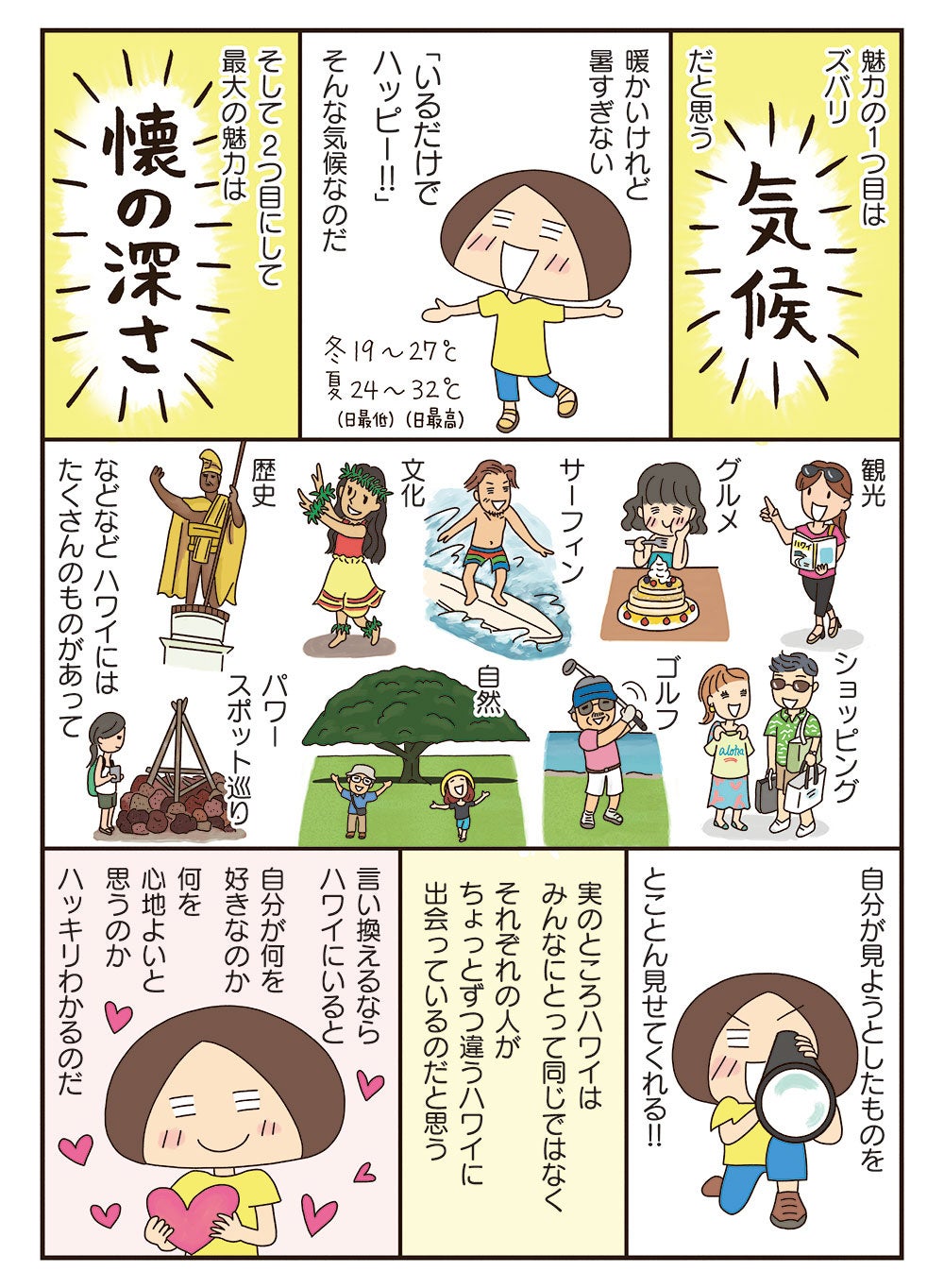 訪れる日本人観光客は年間平均150万人(コロナ以前)で、その7割がリピーターとも言われている、ハワイ。今回の取材で初めてハワイを訪れた鈴木さんも、すっかりその魅力の虜となりました。山も秘境も、グルメも観光も……「やっぱりハワイ!」。そう感じた理由が、現地の人々との出会いを通じて、これまであまりじっくり描かれることの少なかったハワイの歴史や文化とともに描かれます。