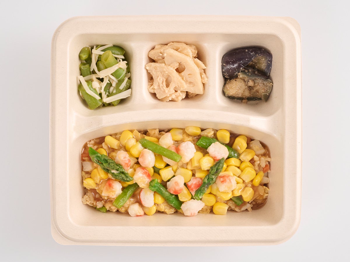 今回新発売する「とろたま仕立て彩りあんかけごはん」は、寒い季節にぴったりの、具沢山な中華ごはんメニューです。タケノコなどを加えた炒飯に、コク深いオイスター風味のとろとろ卵あんをたっぷりとかけました。トッピングのかにかま・コーン・アスパラの彩りも華やかで、コーンの甘みが味わいのアクセントに。 大きめのスプーンですくってほおばる楽しさを味わっていただきたい一品です。