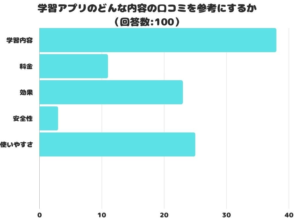 学習アプリのどんな内容の口コミを参考にするかをアンケートにて調査したところ、1位は「学習内容」でした。