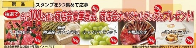 スタンプを3つ集めて応募いただくと、抽選で商店会厳選の景品をプレゼントいたします。