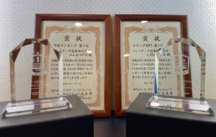 「みんなのFX」は総合部門にて、「LIGHT FX」はスワップ部門にてそれぞれ1位を獲得し、表彰状を授与されました。