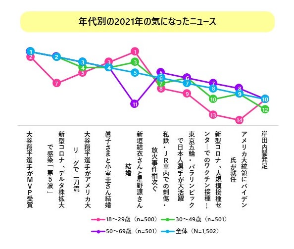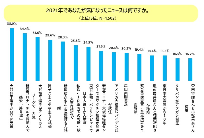 1位「大谷翔平選手がMVP受賞」 2位「新型コロナ、デルタ株拡大で感染「第5波」」 3位「大谷翔平選手がアメリカ大リーグで二刀流」 4位「眞子さまと小室圭さん結婚」 5位「新垣結衣さんと星野源さん結婚」