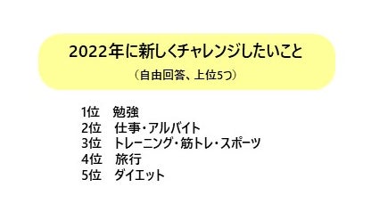 - 2022年に新しくチャレンジしたいことは?前に一歩踏み出したいようなチャレンジが上位に