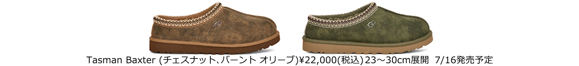 汎⽤性とエフォートレスなスタイルで⻑年にわたり愛され続けている UGGの定番スリッポン Tasmanをアップデートした、Tasman Baxter(タスマン バクスター)は、アッパーには天然のスエードが使⽤されているため、1 ⾜ごとに表情が異なります。履き⼝には、再⽣素材から作られた UGGbraid と UGGのシグネチャーであるツインシームのディテールがあしらわれています。内側には、UGGplush™のライニングとインソールが施されているので、ソックスを履いても、素⾜で履いても、⾄福のぬくもりに包まれます。