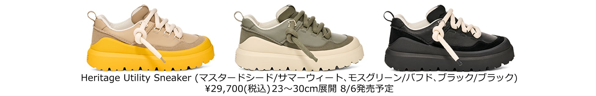 UGGならではの心地よさを誇る Heritage Utility Sneaker (ヘリテージ ユーティリティ スニーカー) は、UGGのアイコニックな要素とクラシックスニーカーの雰囲気を組み合わせ、伝統と新しさを融合しました。アッパーには、フルグレインレザーとスエードを採用し、チャンキーなラウンドレースで仕上げています。内側には、再生素材を含むソフトなテキスタイルのライニングとインソールを施し、サトウキビ由来の軽量 EVA のアウトソールには、グリップ力の高い Spider Rubber Pods が採用され、滑りやすい路面でも安心! フラットレースも付属するので、コーデの幅が広がります。