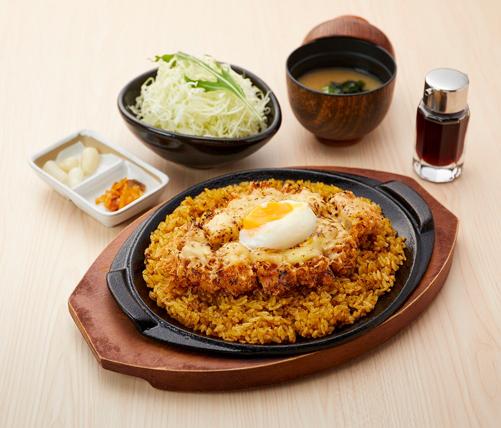 鉄板の上にドライカレーとロースかつをのせ、上からチーズをかけて焼き上げた夏ならではのメニューです。