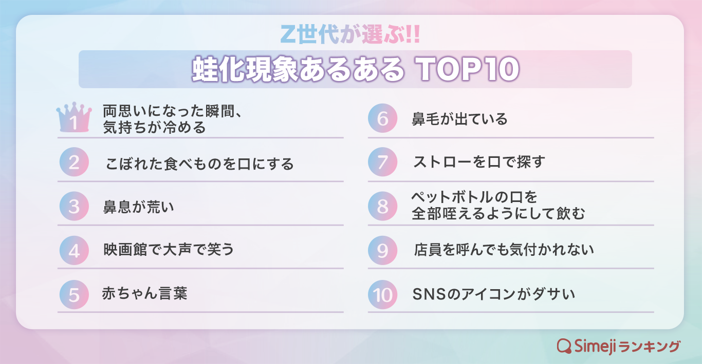 【Simejiランキング】Z世代が選ぶ!!「蛙化現象あるあるTOP10」