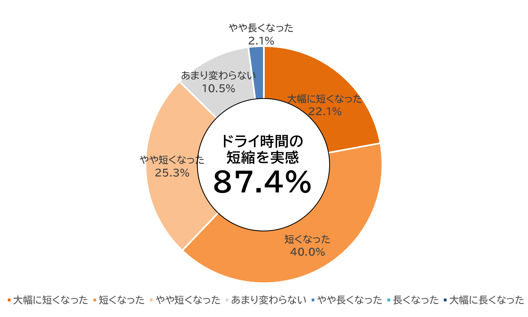 Q. あなたは、ヘアドライヤー「エレガンジェット」をお使いになって、ドライ時間に変化はありましたか?あてはまるものをお選びください。(単数回答/n=95)