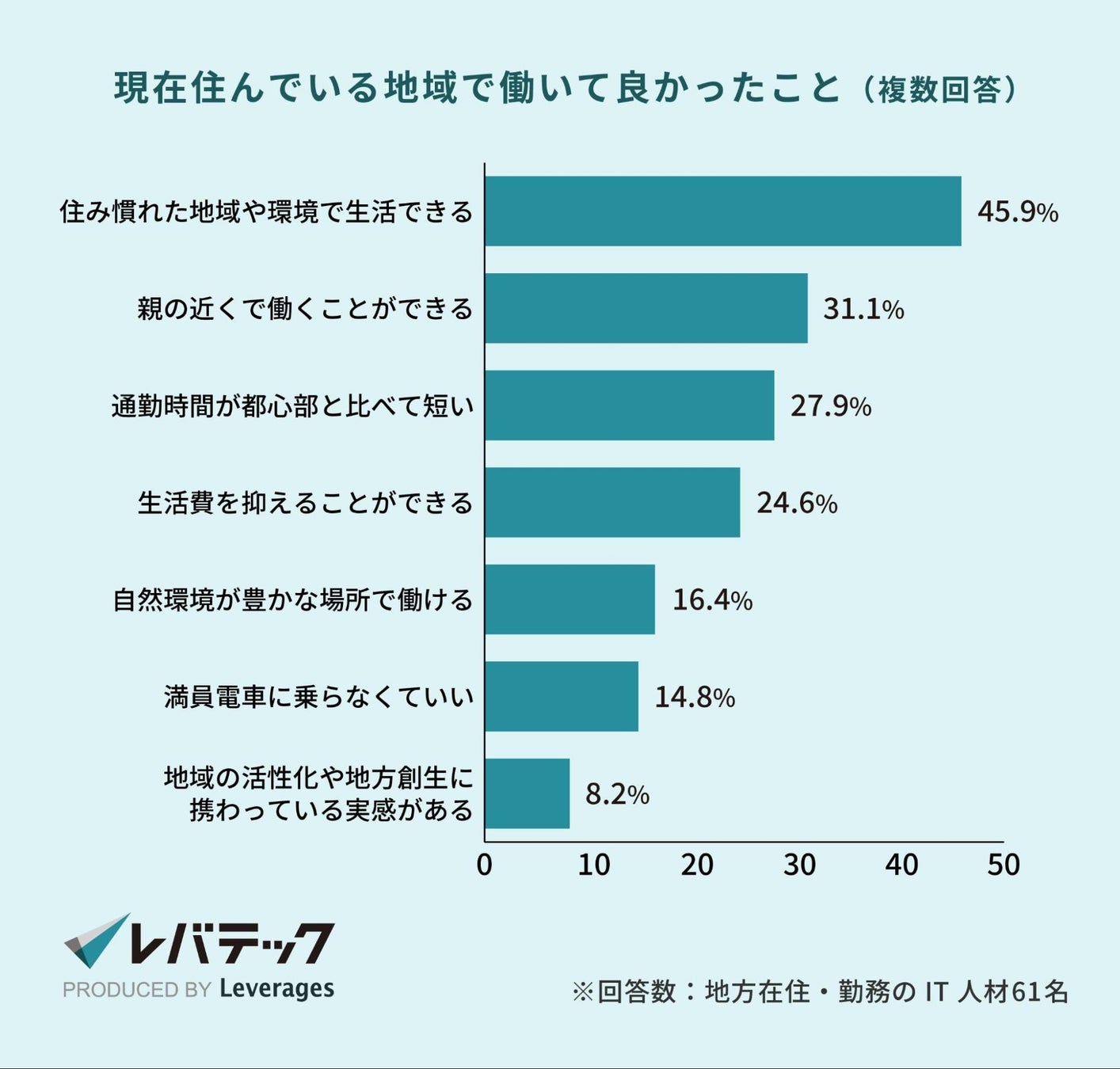 地方で働いていて良かったことについては、「住み慣れた地域や環境で生活できる(45.9%)」や「親の近くで働くことができる(31.1%)」「通勤時間が都心部と比べて短い(14.8%)」が上位に並んでいます。慣れ親しんだ環境での生活や良好なアクセス環境が、地方で働く魅力となっているようです。副業やフリーランスとしての参画だけでなく、地方で働き続けたいと考える人が、求めるキャリアを実現できる体制や制度を整備していくことも重要となるでしょう。
