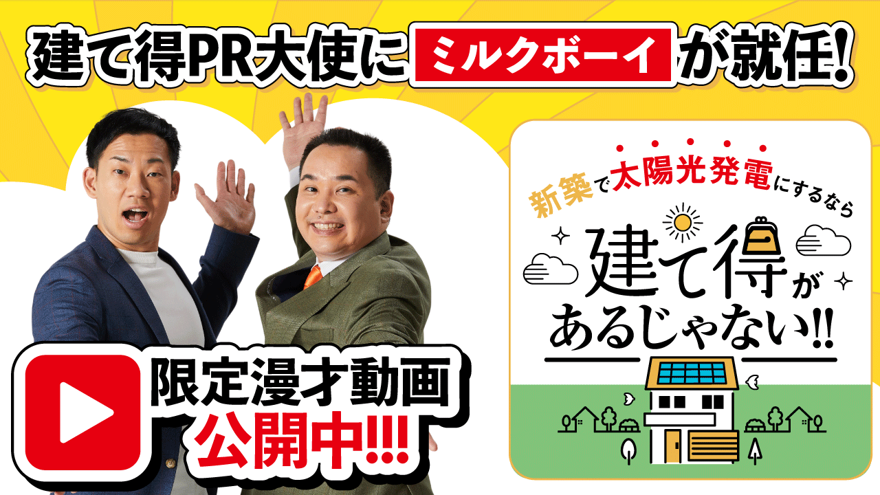 この度、「建て得」のPR大使としてミルクボーイを起用し、「建て得」を題材とした特別漫才動画を制作いたしました。本動画では、漫才でおなじみのサンパチマイクが置かれた劇場さながらのセットで、内海さんの躍動感あふれる話芸と駒場さんの絶妙なツッコミを通して、「建て得」の特長である「実質0円(※1)で太陽光発電システム設置」や「月々の電気代削減」といったメリットを印象的に表現しています。
