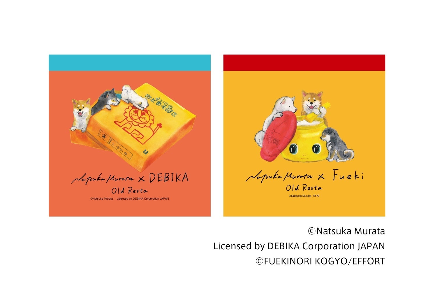 村田夏佳作品でおなじみの柴犬たちが、「デビカ」「フエキ」の文具と楽しそうに遊ぶ姿を描き下ろした、限定デザインです。