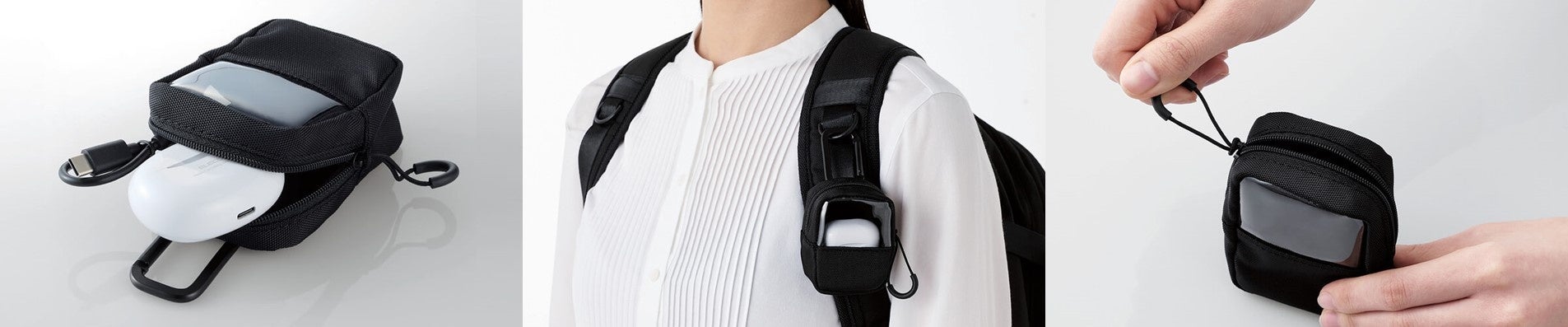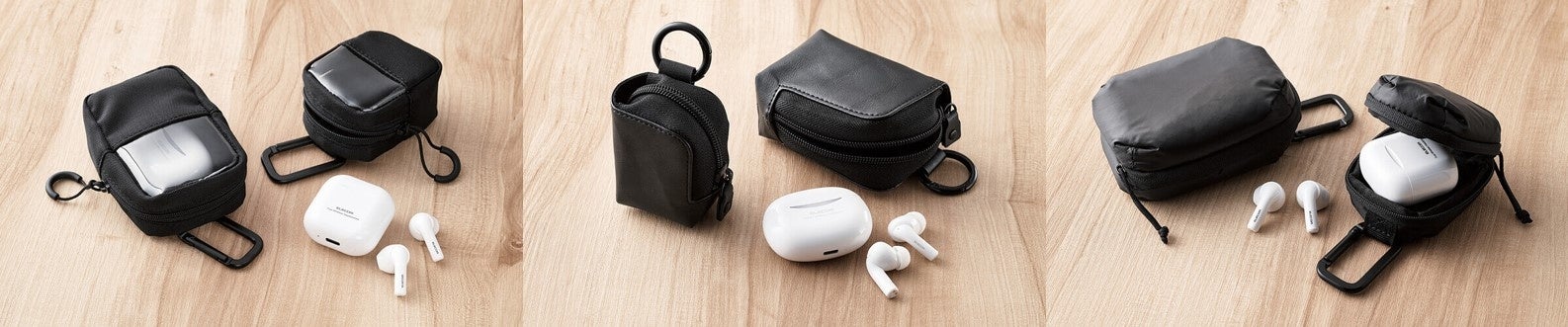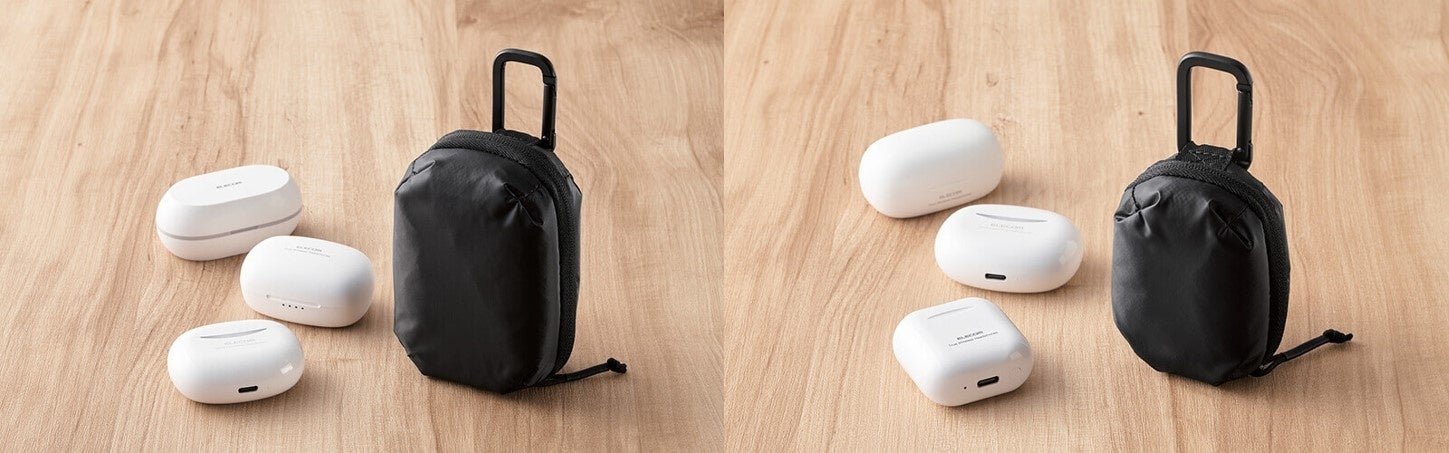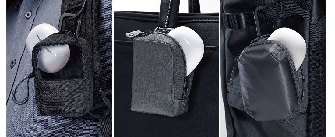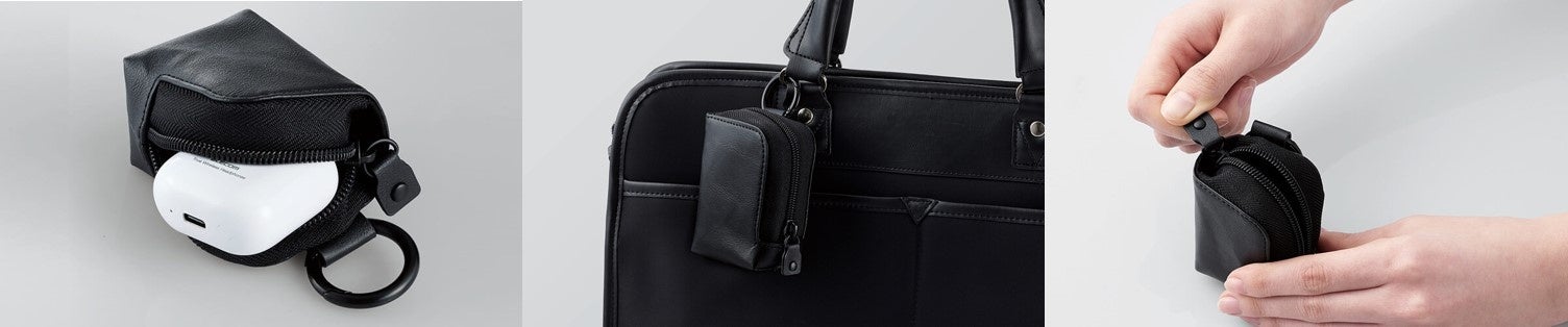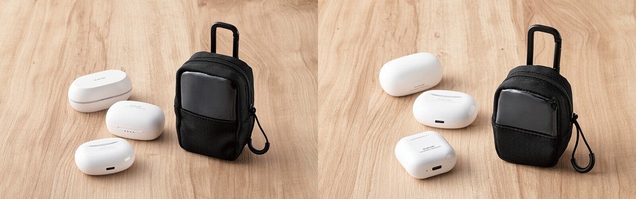 かばんのベルトなどに取り付けて簡単に取り出しが可能!素材で選べる3タイプ×2サイズ 計6アイテムの完全ワイヤレスイヤホン コンパクトポーチを新発売