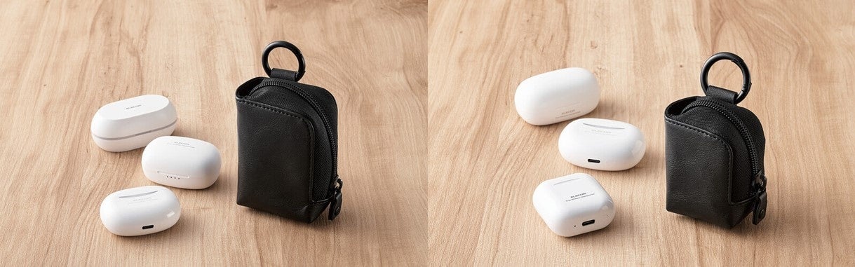 ▲ TWS-EP23Pシリーズ(写真右):撥水性のあるパファー素材を使用、クッション性のある中綿で衝撃からイヤホンを保護