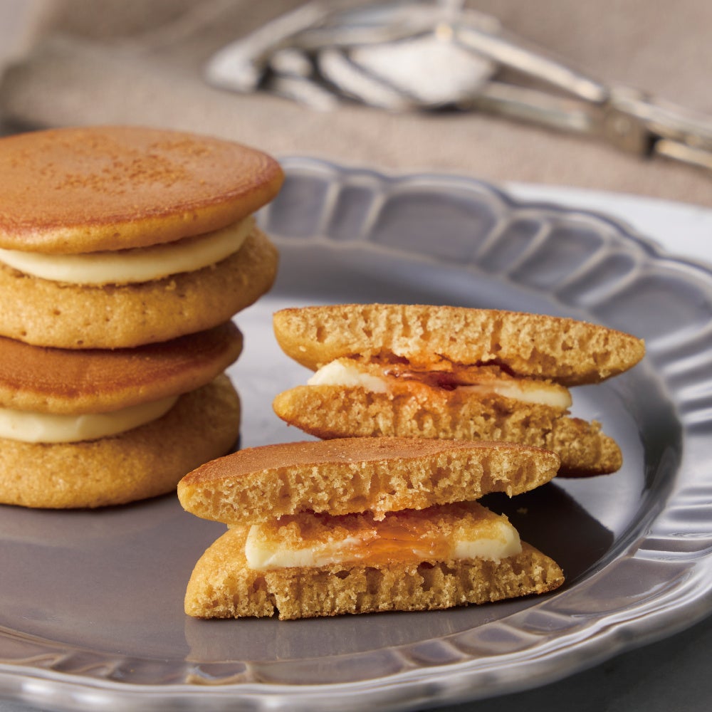 ふわふわに焼き上げたパンケーキに、甘く香ばしい風味とまろやかな甘さが魅力のキャラメルクリームを贅沢にサンドしました。手のひらにそっと収まる上品なサイズは、紅茶とともに気軽に楽しめるのも魅力。