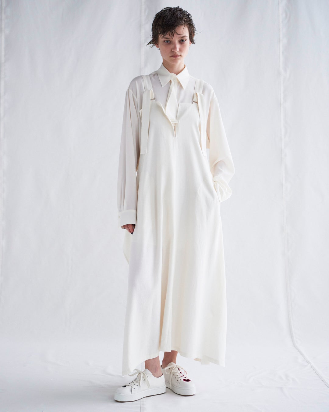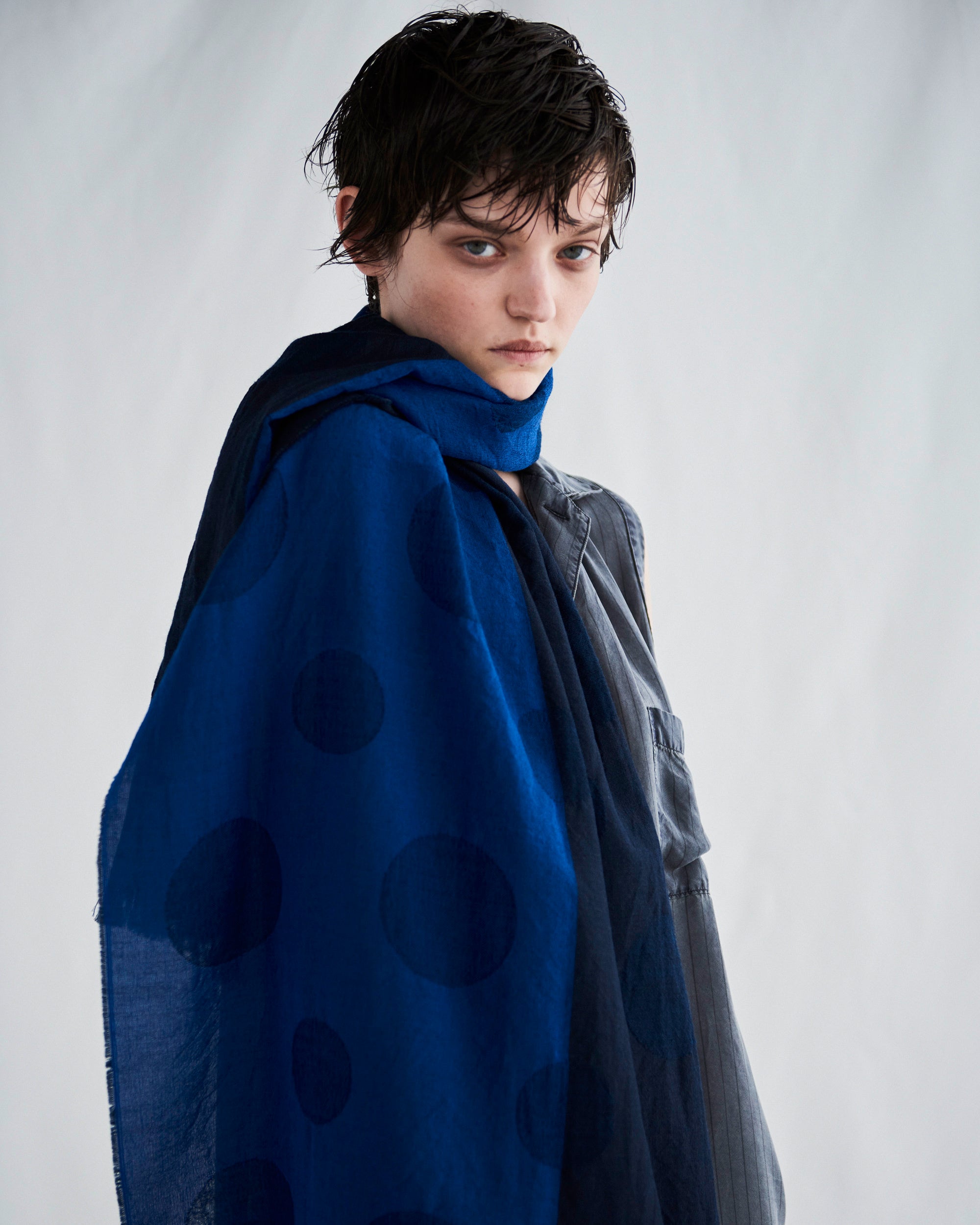 柔らかなオフホワイト、凛とした青──シルエットが色に染まる。マニッシュなストライプや、労働着に由来するデニム素材で仕立てられた服を上品に纏う。水玉柄に無造作に置かれる筆跡。掠れたペイントに構成される黄や青の鮮やかな線。跡のように生地に残された水玉模様。抜けをつくる透け感。暗がりを照らす、クリーンでエレガントな服。