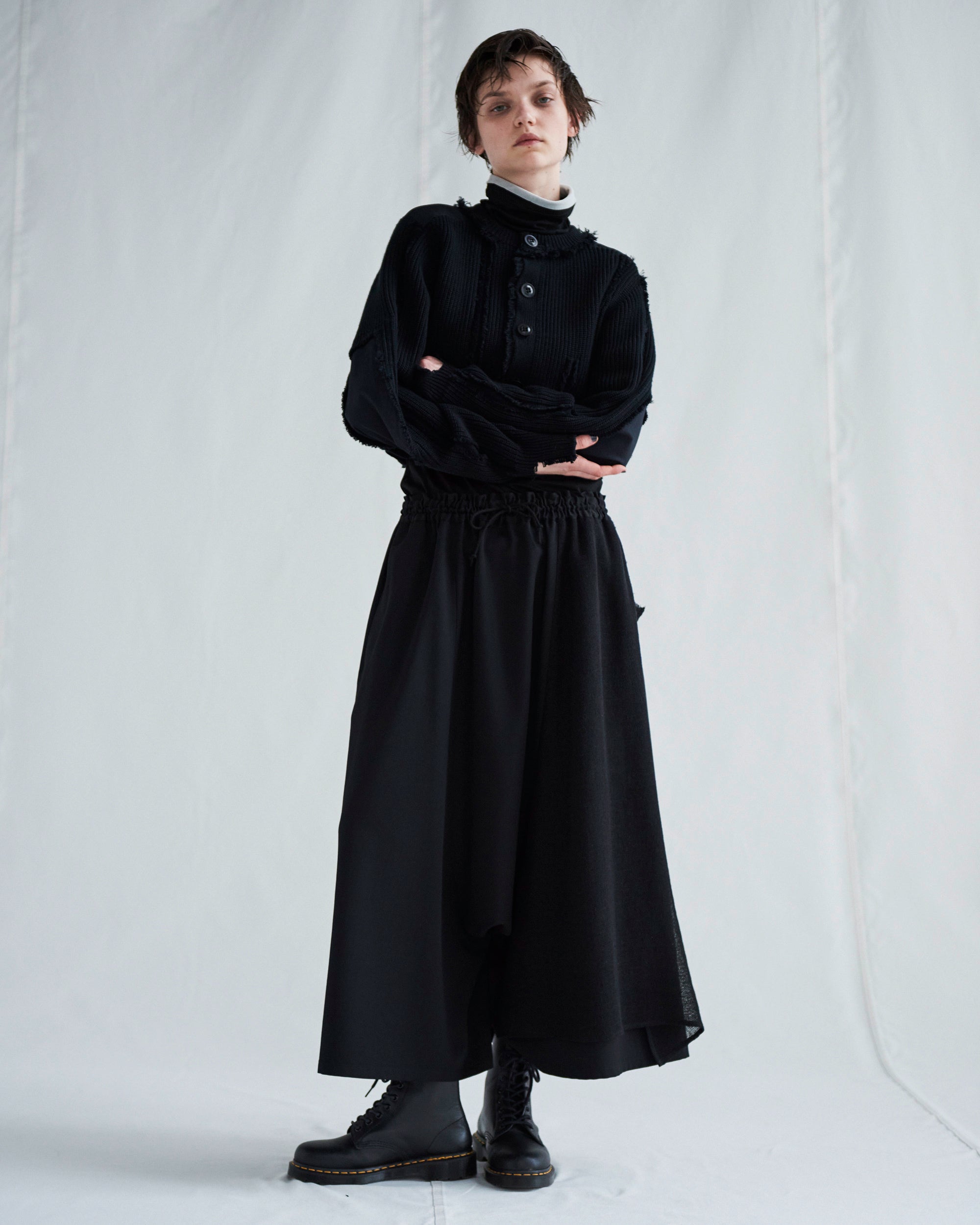 目のつまった編地に切り傷のようなフリンジや穴を編み続きで施したコットンニットカーディガン。透け感のあるガーゼ生地が首元にあしらわれた肌触りの良いコットンフライス生地の半袖カットソー。カラミ織生地が構成されたウールギャバジンのギャザーパンツ。