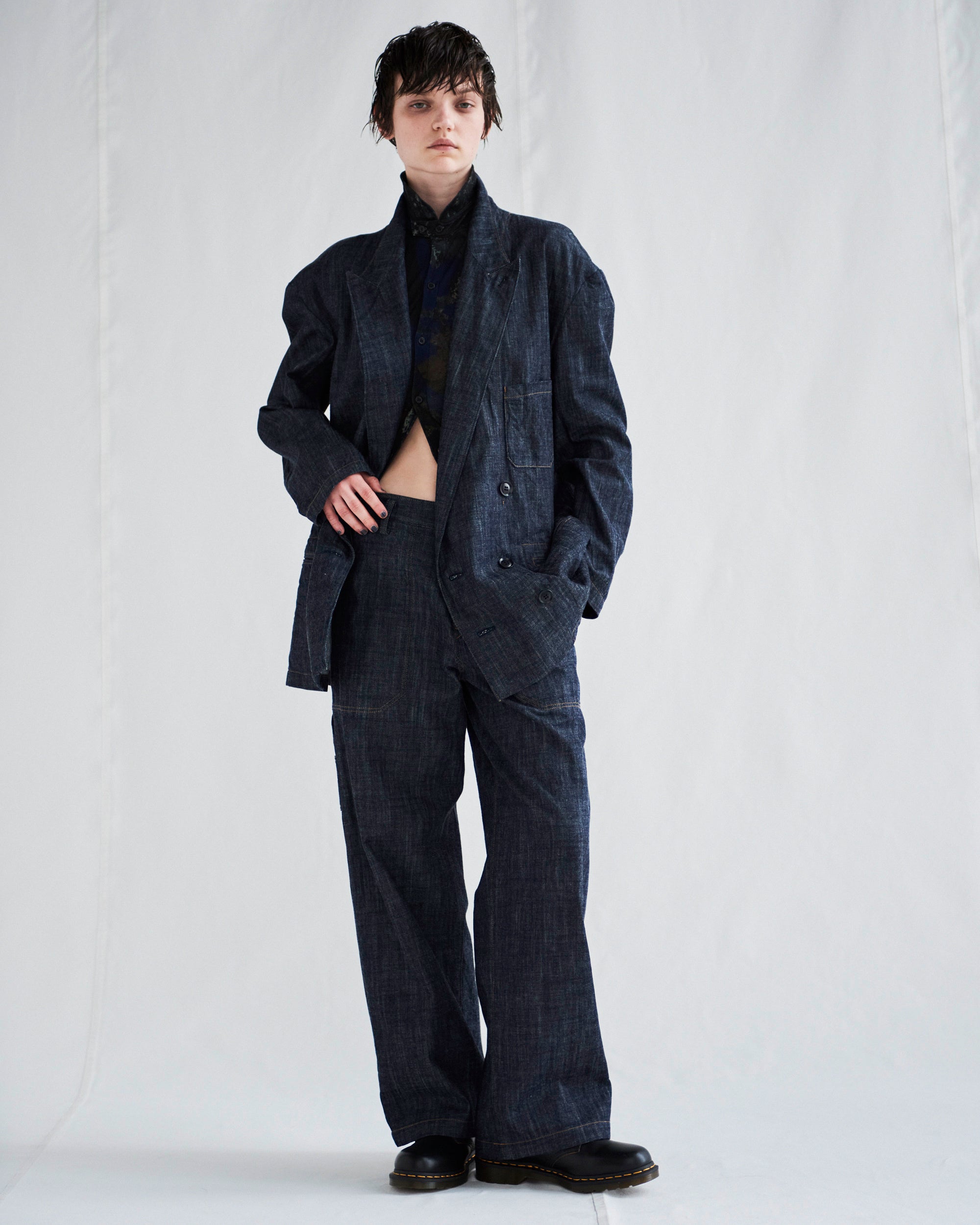 ラペルの返り止まりが低く重心が下がったフォルムのピークドラペルジャケットと、ワークパンツ。製品洗いされたデニム生地は、太い糸の所々が細くなる逆スラブ糸を使用することで絶妙な膨らみをもった風合いを持つ。