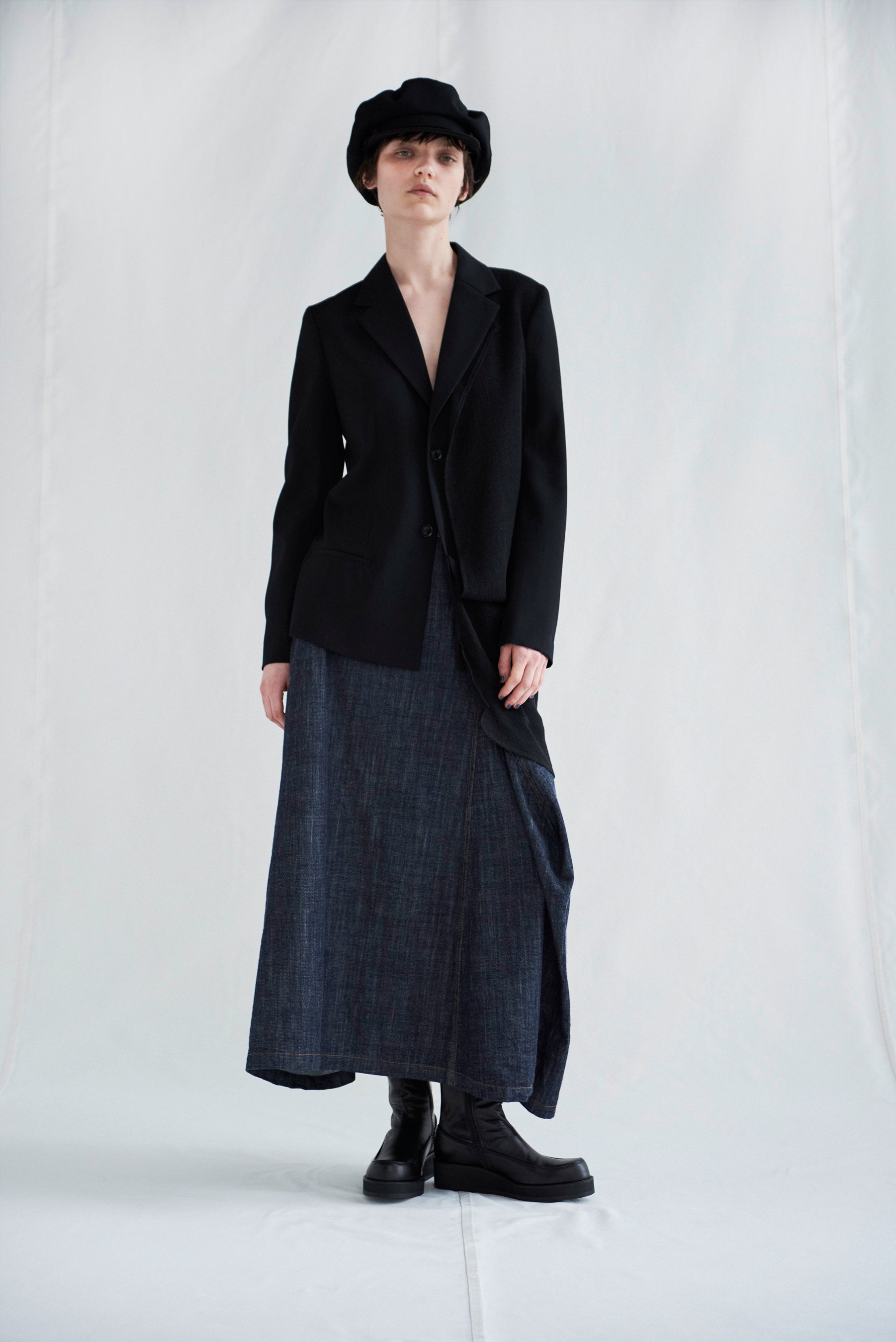 左前が二重になり、上身頃の造作でドレープが生まれるジャケット。デニム素材のアシンメトリーフレアスカート。