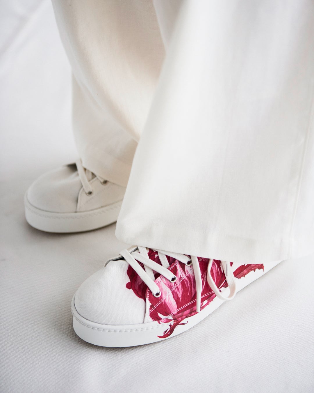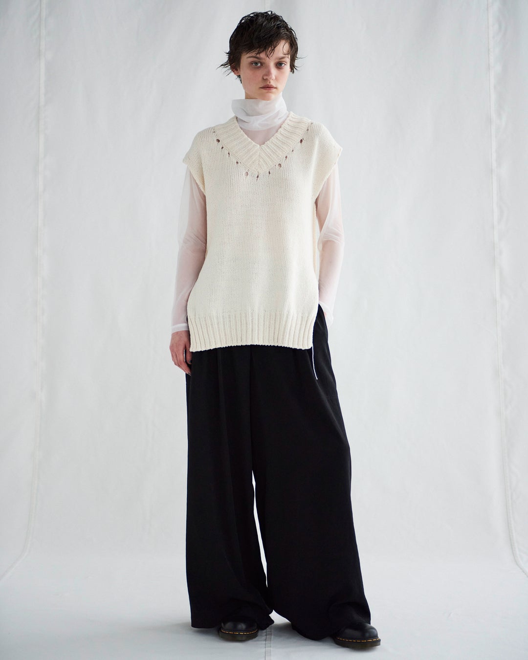 糸端を残したり、縫い代を表に出し雑味のある表現をしたコットン素材のニットベスト。ひとつひとつ職人の手作業でプリントされた、浮いているような水玉柄の透け感のあるハイネックカットソー。柔らかなタックワイドパンツ。