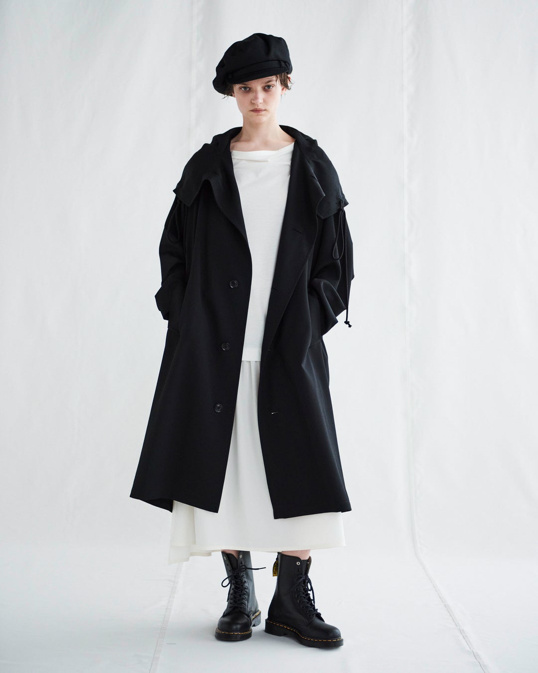 フレンチスリーブドレスに、大きめのフードが付いたウールギャバジン生地のコートを羽織るワイズらしいシルエット。コートと同素材のウールギャバジンでつくられたモーターサイクルキャップ。