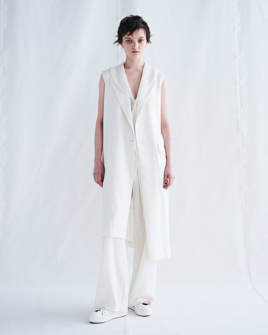 柔らかなオフホワイトで描かれる、レーヨン・リネンのノースリーブアシンメトリージャケットとワークパンツ。